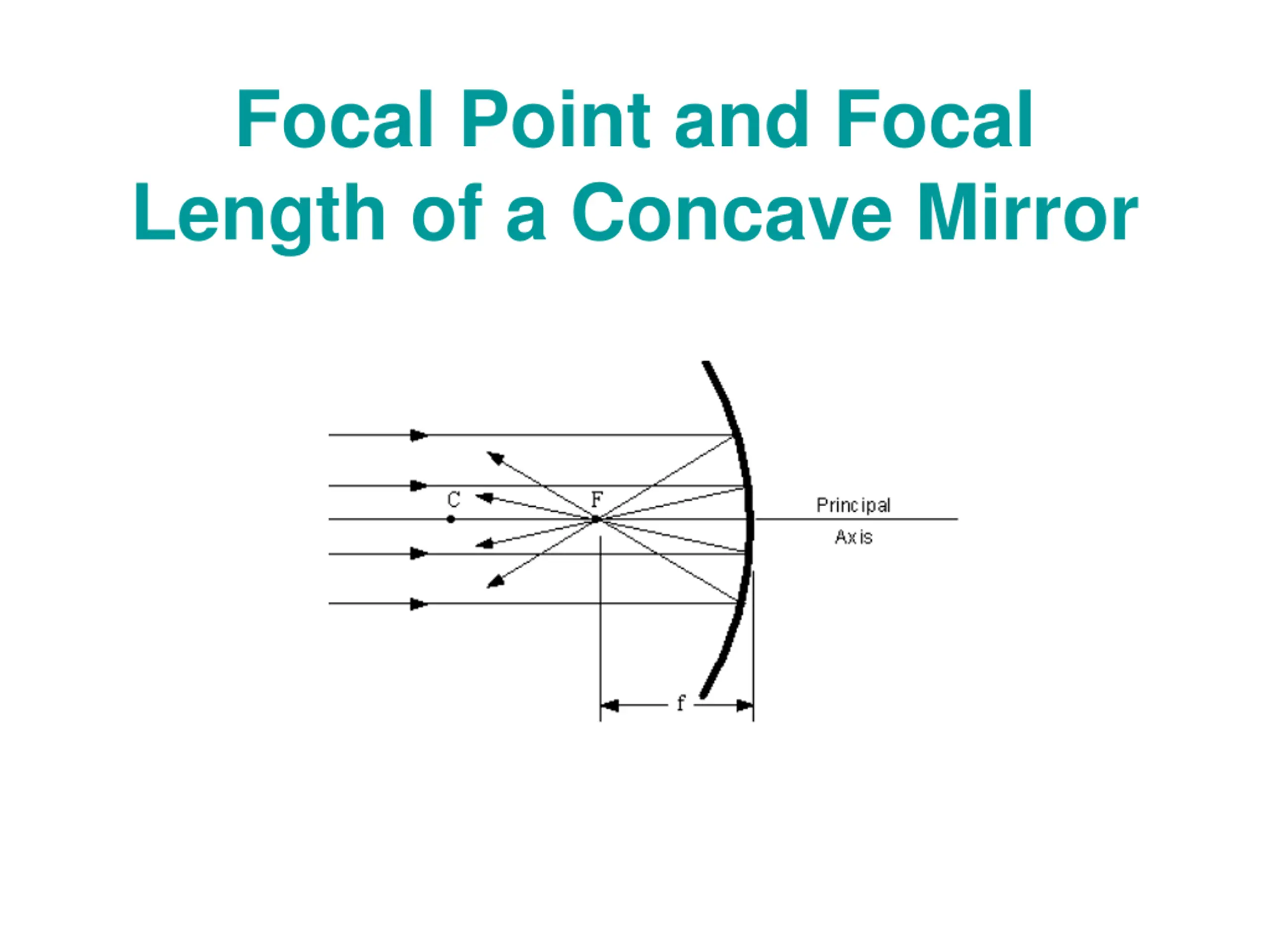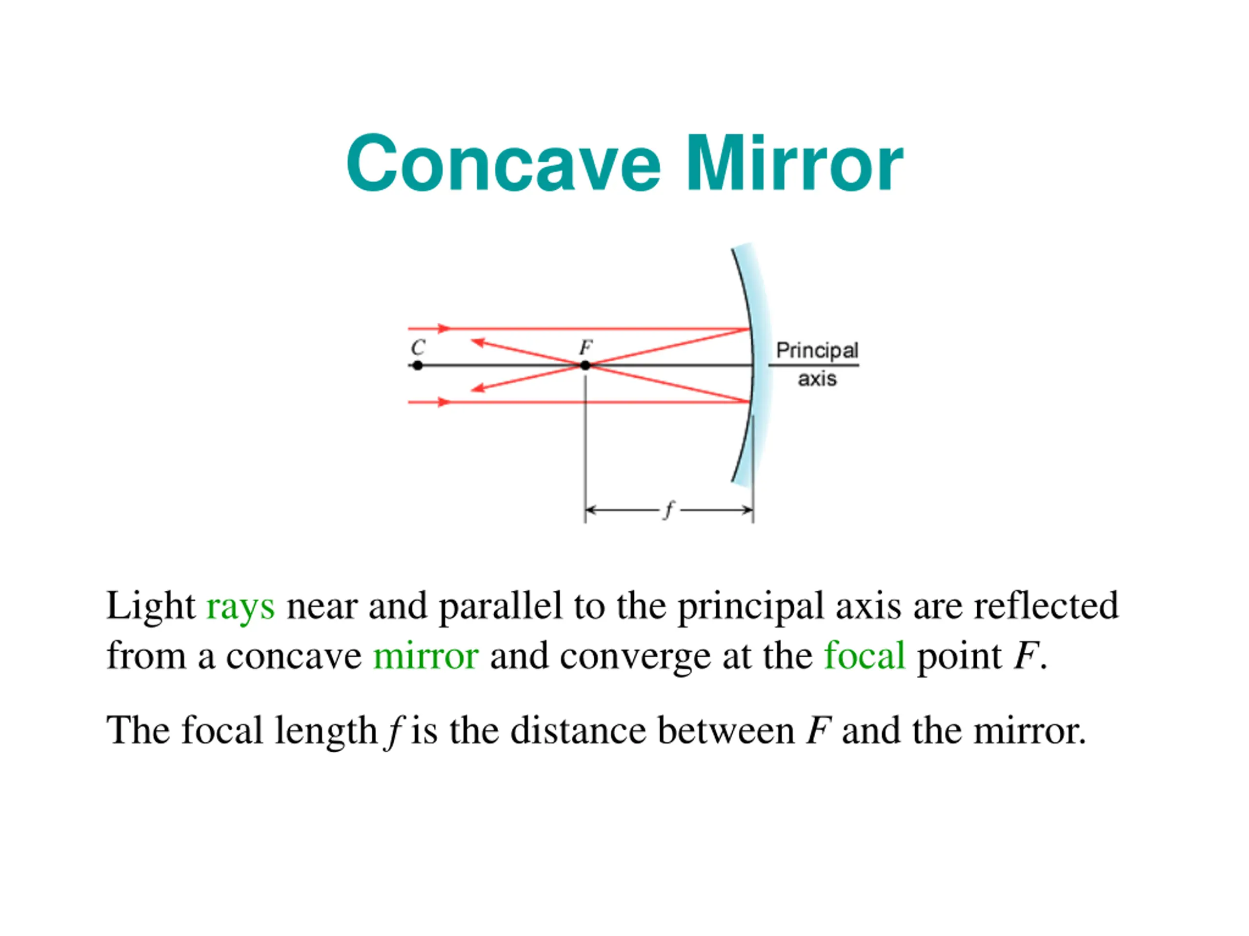 Concave Mirror Light rays near and parallel to the principal axis are reflected from a concave mirror and converge at the focal point F. The focal length f is the distance between F and the mirror.