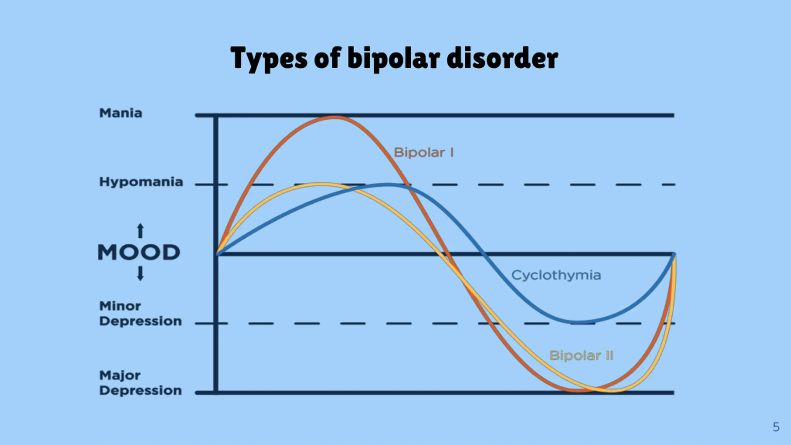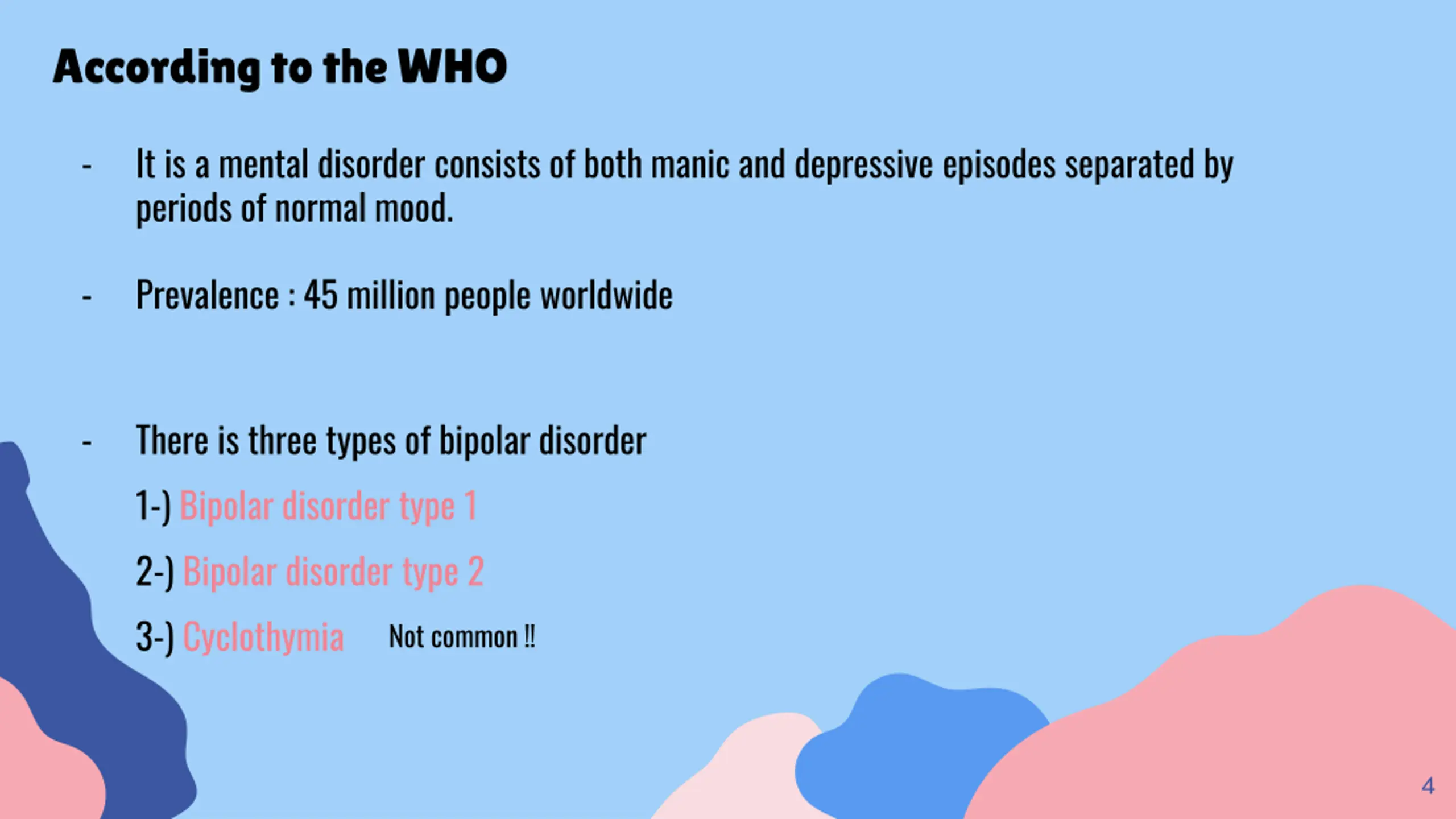 According to the WHO - It is a mental disorder consists of both manic and depressive episodes separated by periods of normal mood. - Prevalence : 45 million people worldwide - There is three types of bipolar disorder 1-) Bipolar disorder type 1 2-) Bipolar disorder type 2 3-) Cyclothymia Not common !! 4