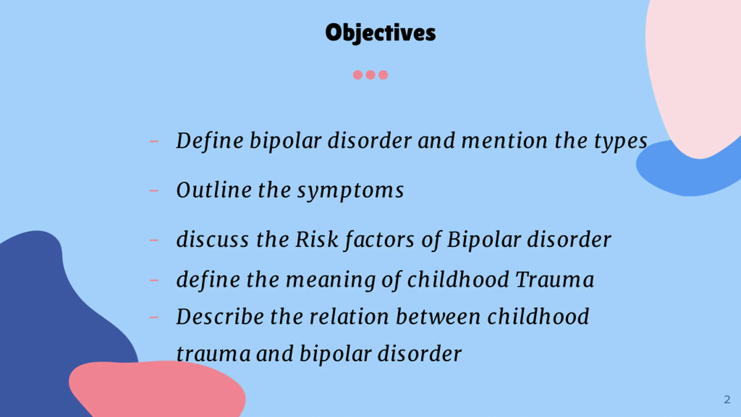 Objectives - Define bipolar disorder and mention the types - Outline the symptoms - discuss the Risk factors of Bipolar disorder - define the meaning of childhood Trauma - Describe the relation between childhood trauma and bipolar disorder 2