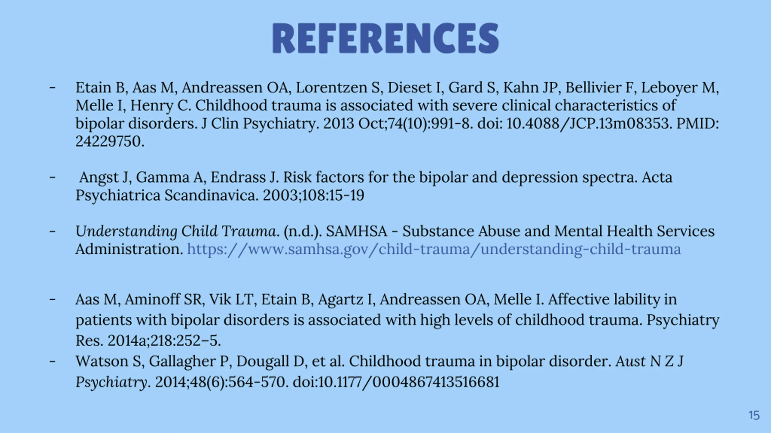 REFERENCES - Etain B, Aas M, Andreassen OA, Lorentzen S, Dieset I, Gard S, Kahn JP, Bellivier F, Leboyer M, Melle I, Henry C. Childhood trauma is associated with severe clinical characteristics of bipolar disorders. J Clin Psychiatry. 2013 Oct;74(10):991-8. doi: 10.4088/JCP.13m08353. PMID: 24229750. - Angst J, Gamma A, Endrass J. Risk factors for the bipolar and depression spectra. Acta Psychiatrica Scandinavica. 2003;108:15-19 Understanding Child Trauma. (n.d.). SAMHSA - Substance Abuse and Mental Health Services Administration. https://www.samhsa.gov/child-trauma/understanding-child-trauma - - Aas M, Aminoff SR, Vik LT, Etain B, Agartz I, Andreassen OA, Melle I. Affective lability in patients with bipolar disorders is associated with high levels of childhood trauma. Psychiatry Res. 2014a;218:252 5. Watson S, Gallagher P, Dougall D, et al. Childhood trauma in bipolar disorder. Aust N Z J Psychiatry. 2014;48(6):564-570. doi:10.1177/0004867413516681 - 15