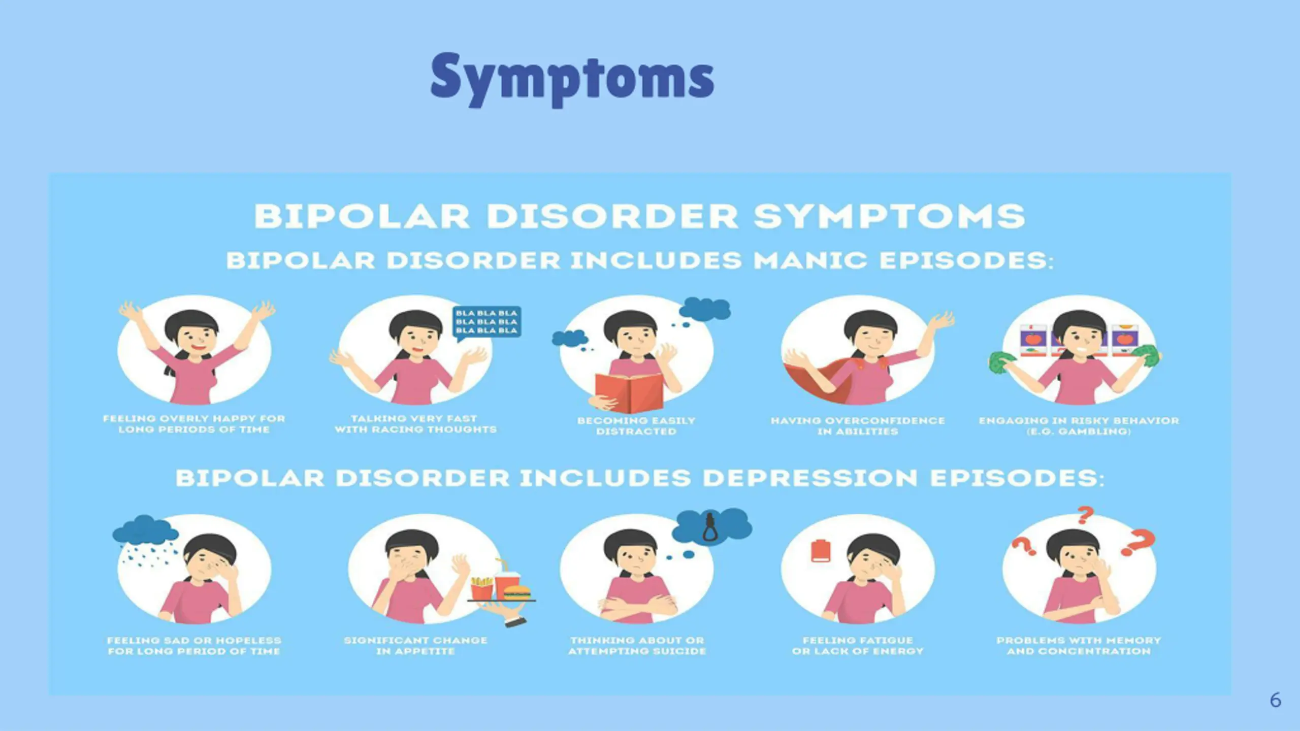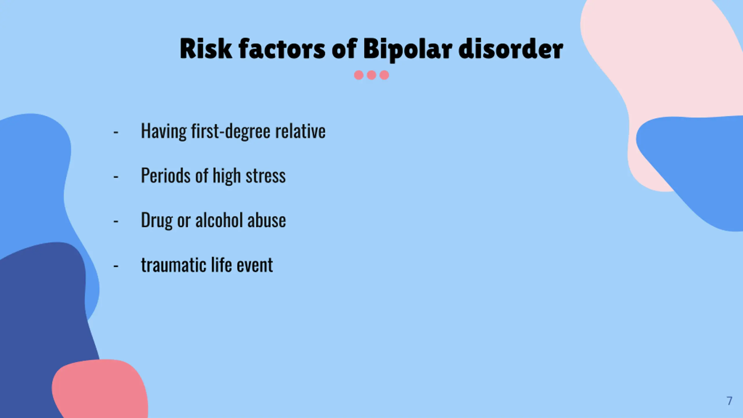 Risk factors of Bipolar disorder - Having first-degree relative - Periods of high stress - Drug or alcohol abuse - traumatic life event 7