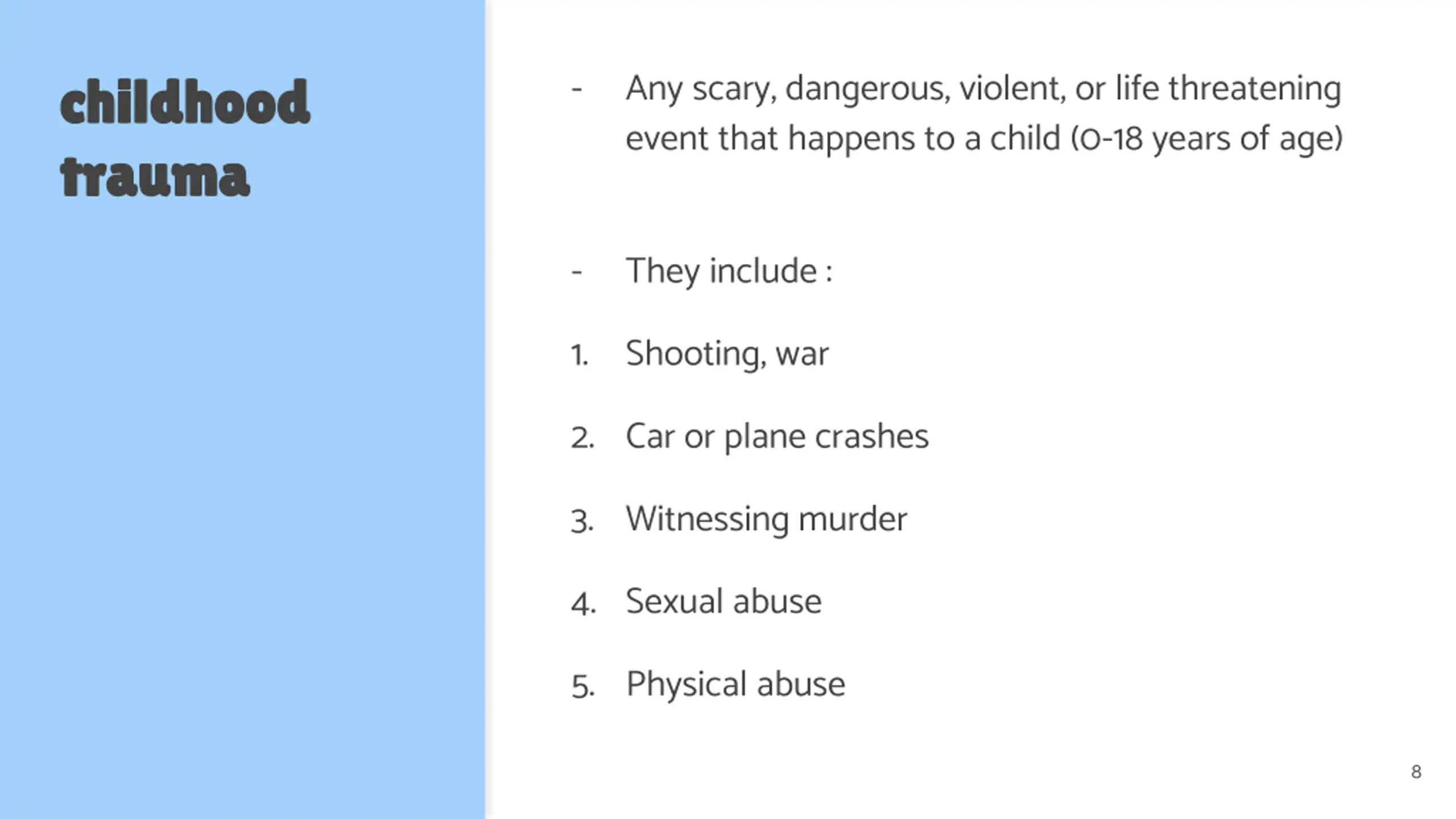 - Any scary, dangerous, violent, or life threatening event that happens to a child (0-18 years of age) childhood childhood trauma trauma - They include : 1. Shooting, war 2. Car or plane crashes 3. Witnessing murder 4. Sexual abuse 5. Physical abuse 8