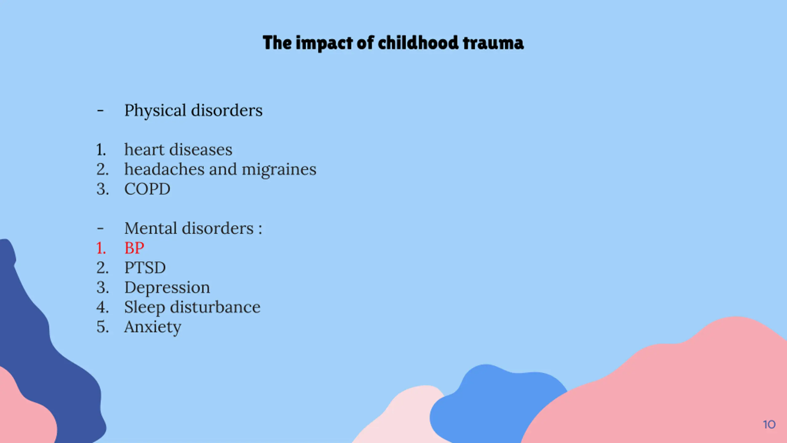 The impact of childhood trauma - Physical disorders 1. 2. 3. COPD heart diseases headaches and migraines - 1. 2. 3. Depression 4. Sleep disturbance 5. Anxiety Mental disorders : BP PTSD 10