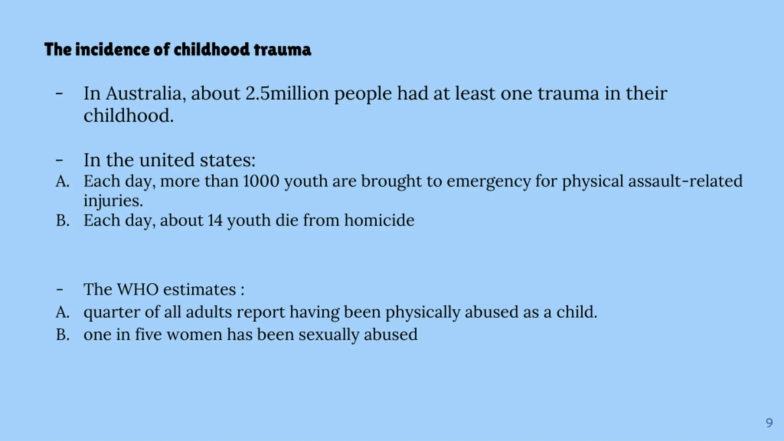 The incidence of childhood trauma - In Australia, about 2.5million people had at least one trauma in their childhood. - A. Each day, more than 1000 youth are brought to emergency for physical assault-related injuries. B. Each day, about 14 youth die from homicide In the united states: - A. quarter of all adults report having been physically abused as a child. B. one in five women has been sexually abused The WHO estimates : 9
