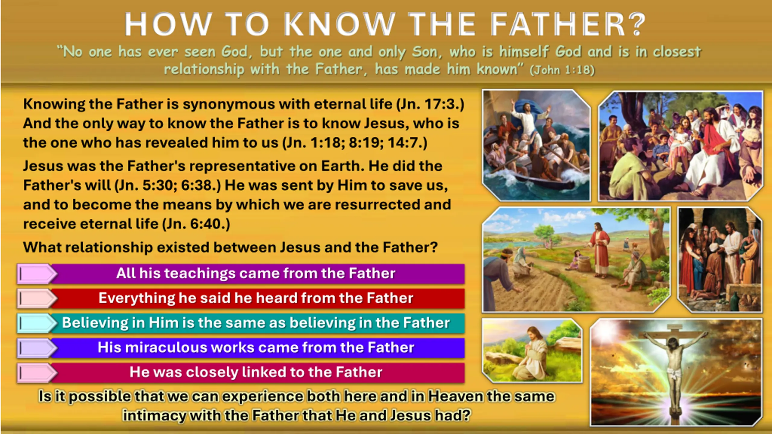 HOW TO KNOW THE FATHER? No one has ever seen God, but the one and only Son, who is himself God and is in closest relationship with the Father, has made him known (John 1:18) Knowing the Father is synonymous with eternal life (Jn. 17:3.) And the only way to know the Father is to know Jesus, who is the one who has revealed him to us (Jn. 1:18; 8:19; 14:7.) Jesus was the Father's representative on Earth. He did the Father's will (Jn. 5:30; 6:38.) He was sent by Him to save us, and to become the means by which we are resurrected and receive eternal life (Jn. 6:40.) What relationship existed between Jesus and the Father? All his teachings came from the Father Everything he said he heard from the Father Believing in Him is the same as believing in the Father His miraculous works came from the Father He was closely linked to the Father Is it possible that we can experience both here and in Heaven the same intimacy with the Father that He and Jesus had?