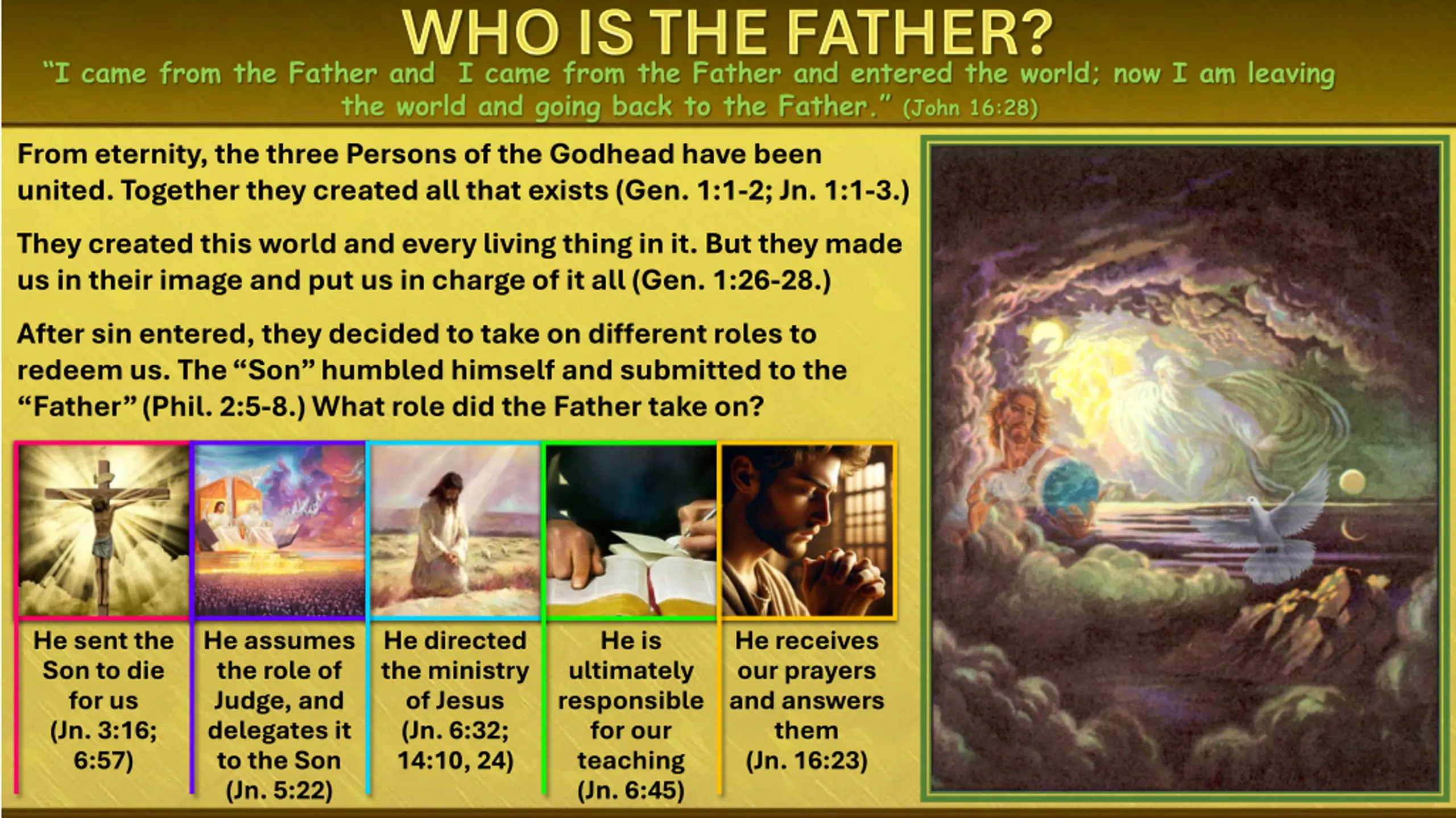 I came from the Father and I came from the Father and entered the world; now I am leaving the world and going back to the Father. (John 16:28) From eternity, the three Persons of the Godhead have been united. Together they created all that exists (Gen. 1:1-2; Jn. 1:1-3.) They created this world and every living thing in it. But they made us in their image and put us in charge of it all (Gen. 1:26-28.) After sin entered, they decided to take on different roles to redeem us. The Son humbled himself and submitted to the Father (Phil. 2:5-8.) What role did the Father take on? He sent the Son to die for us (Jn. 3:16; 6:57) He assumes the role of Judge, and delegates it to the Son (Jn. 5:22) He directed the ministry of Jesus (Jn. 6:32; 14:10, 24) He is ultimately responsible for our teaching (Jn. 6:45) He receives our prayers and answers them (Jn. 16:23)