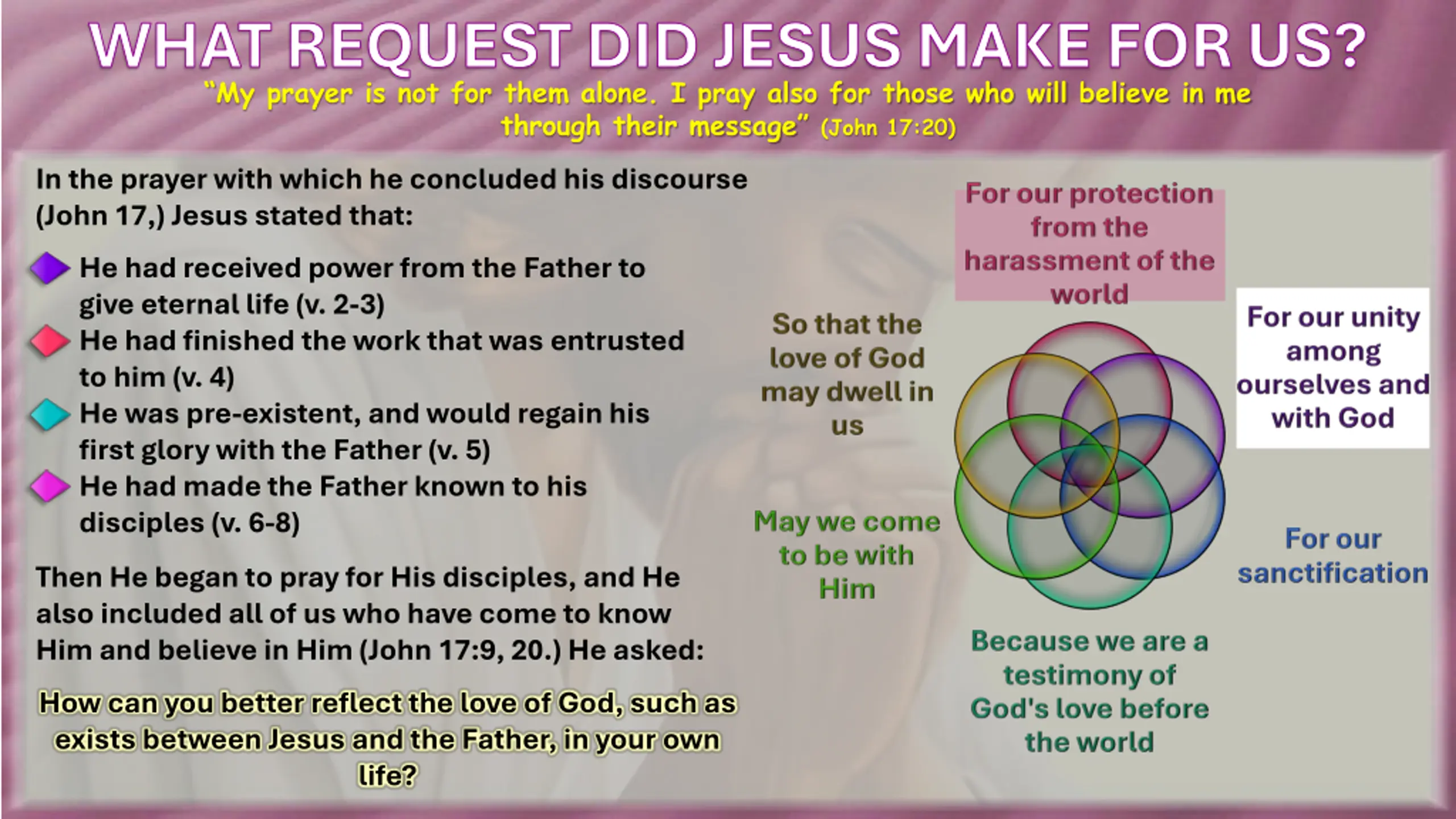 WHAT REQUEST DID JESUS MAKE FOR US? My prayer is not for them alone. I pray also for those who will believe in me through their message (John 17:20) In the prayer with which he concluded his discourse (John 17,) Jesus stated that: He had received power from the Father to give eternal life (v. 2-3) He had finished the work that was entrusted to him (v. 4) He was pre-existent, and would regain his first glory with the Father (v. 5) He had made the Father known to his disciples (v. 6-8) Then He began to pray for His disciples, and He also included all of us who have come to know Him and believe in Him (John 17:9, 20.) He asked: How can you better reflect the love of God, such as exists between Jesus and the Father, in your own life?