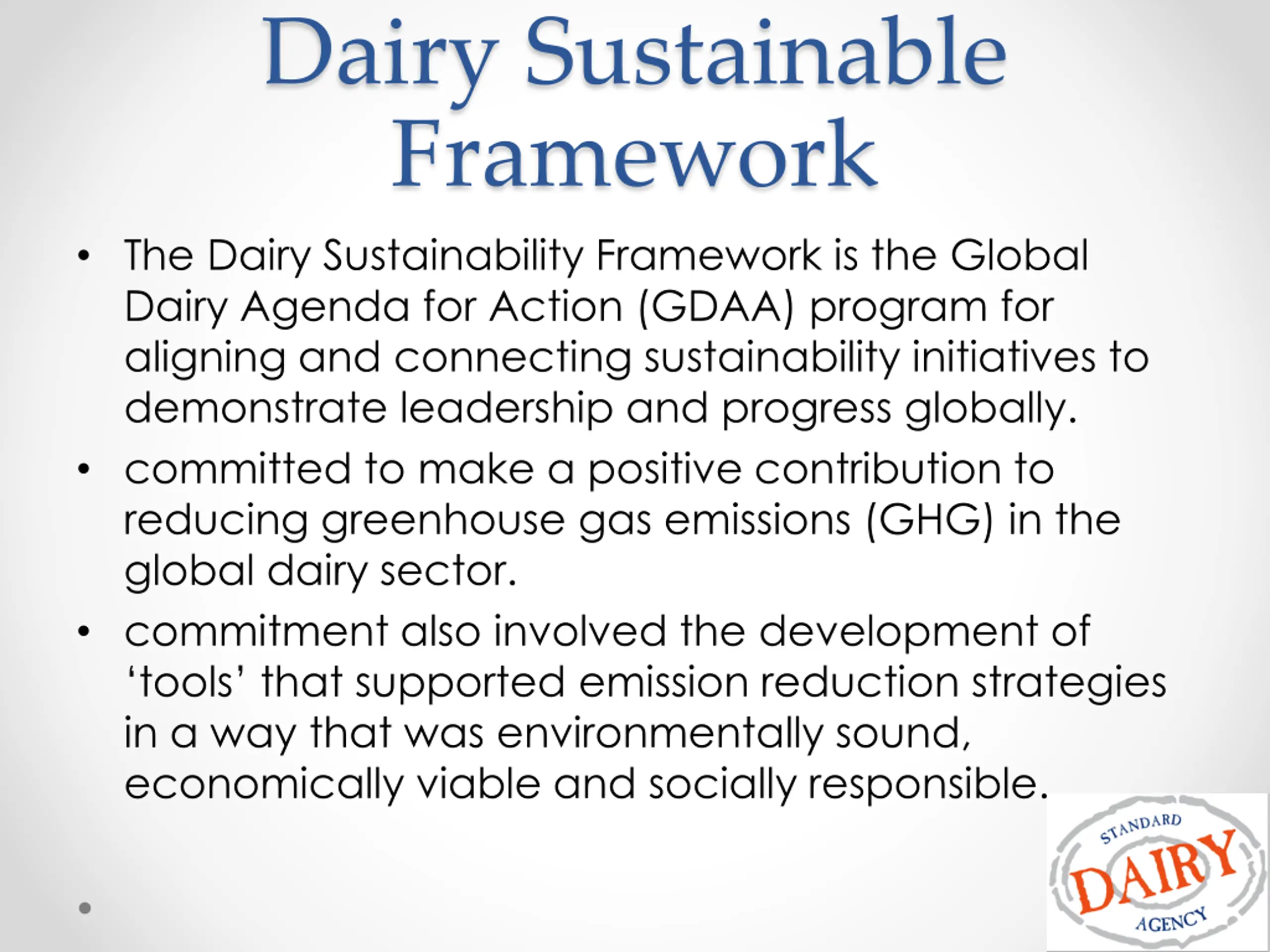 Dairy Sustainable Framework The Dairy Sustainability Framework is the Global Dairy Agenda for Action (GDAA) program for aligning and connecting sustainability initiatives to demonstrate leadership and progress globally. committed to make a positive contribution to reducing greenhouse gas emissions (GHG) in the global dairy sector. commitment also involved the development of tools that supported emission reduction strategies in a way that was environmentally sound, economically viable and socially responsible.