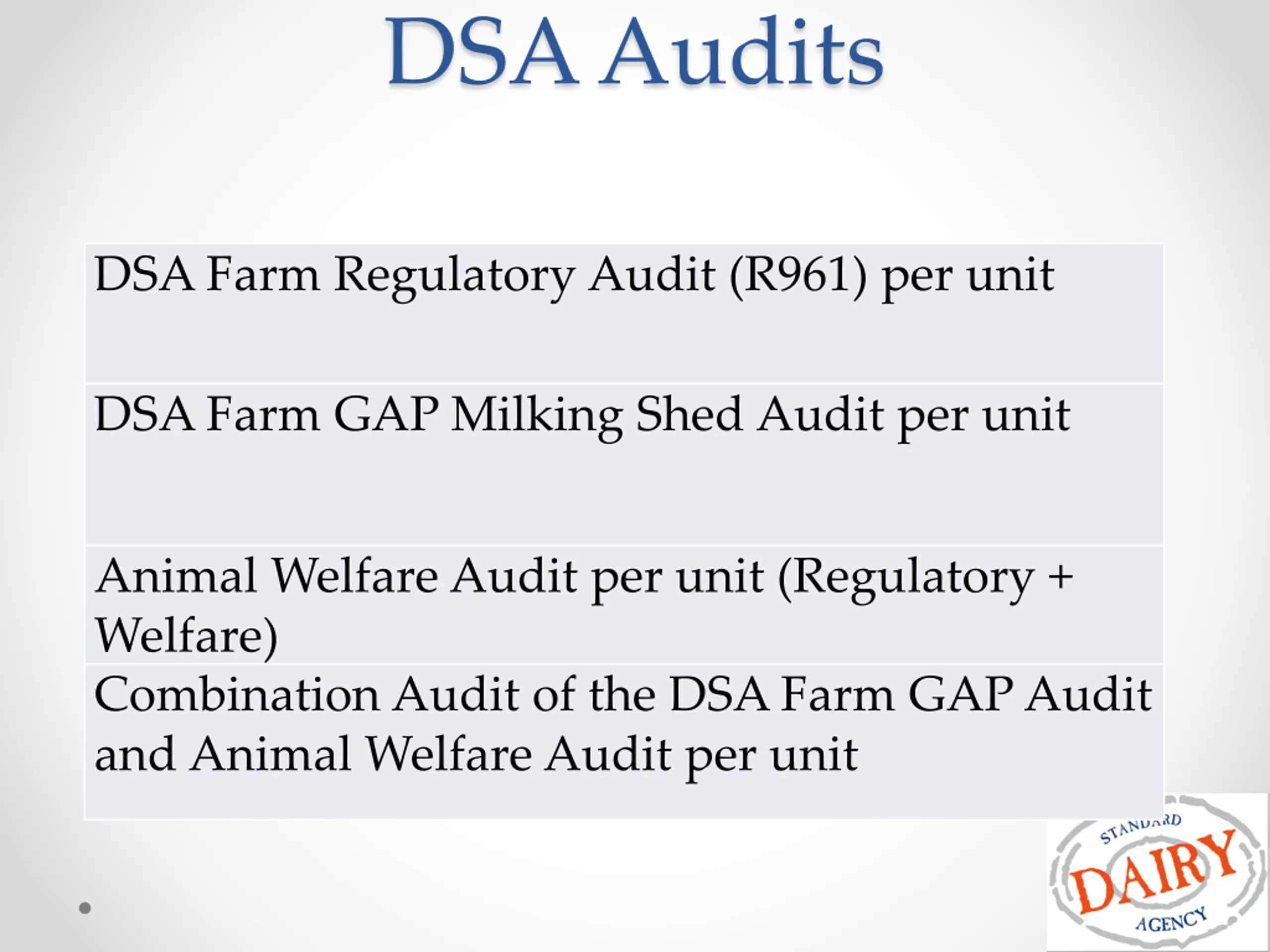 DSA Audits DSA Farm Regulatory Audit (R961) per unit DSA Farm GAP Milking Shed Audit per unit Animal Welfare Audit per unit (Regulatory + Welfare) Combination Audit of the DSA Farm GAP Audit and Animal Welfare Audit per unit