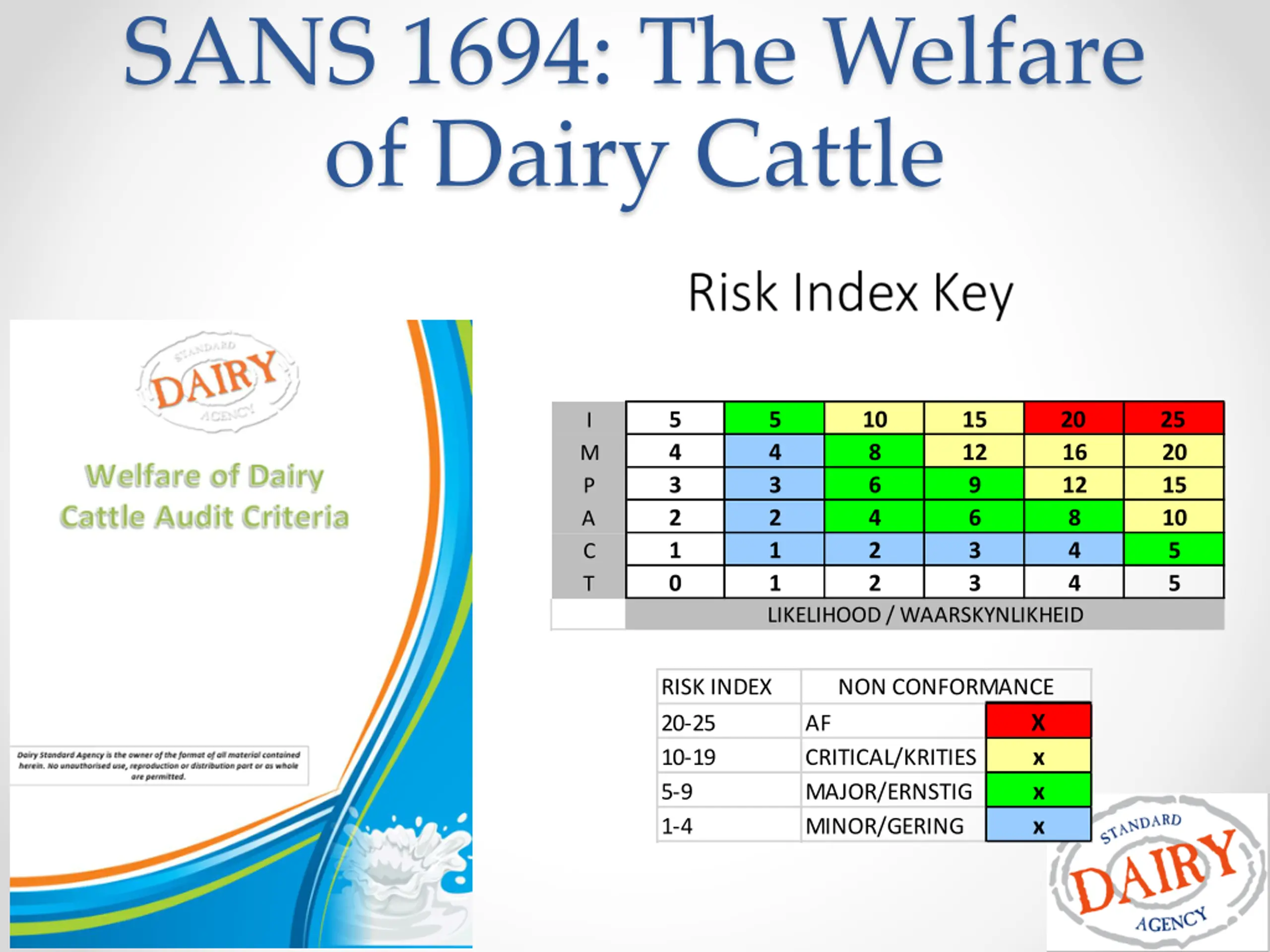 SANS 1694: The Welfare of Dairy Cattle 5 4 3 2 1 0 5 4 3 2 1 1 LIKELIHOOD / WAARSKYNLIKHEID 10 8 6 4 2 2 15 12 9 6 3 3 20 16 12 8 4 4 25 20 15 10 5 5 I M P A C T RISK INDEX 20-25 10-19 5-9 1-4 NON CONFORMANCE X x x x AF CRITICAL/KRITIES MAJOR/ERNSTIG MINOR/GERING