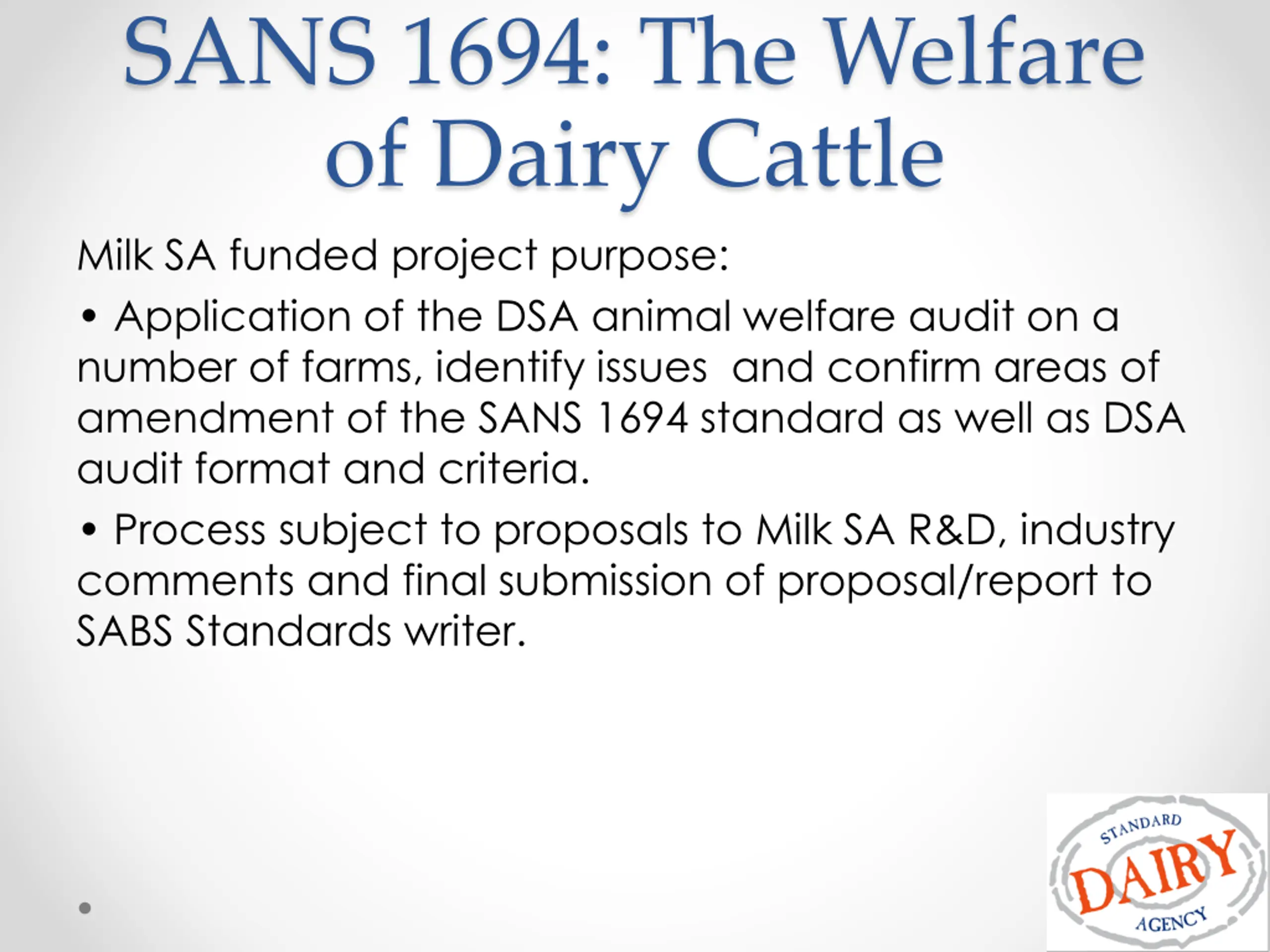 SANS 1694: The Welfare of Dairy Cattle Milk SA funded project purpose: Application of the DSA animal welfare audit on a number of farms, identify issues and confirm areas of amendment of the SANS 1694 standard as well as DSA audit format and criteria. Process subject to proposals to Milk SA R&D, industry comments and final submission of proposal/report to SABS Standards writer.