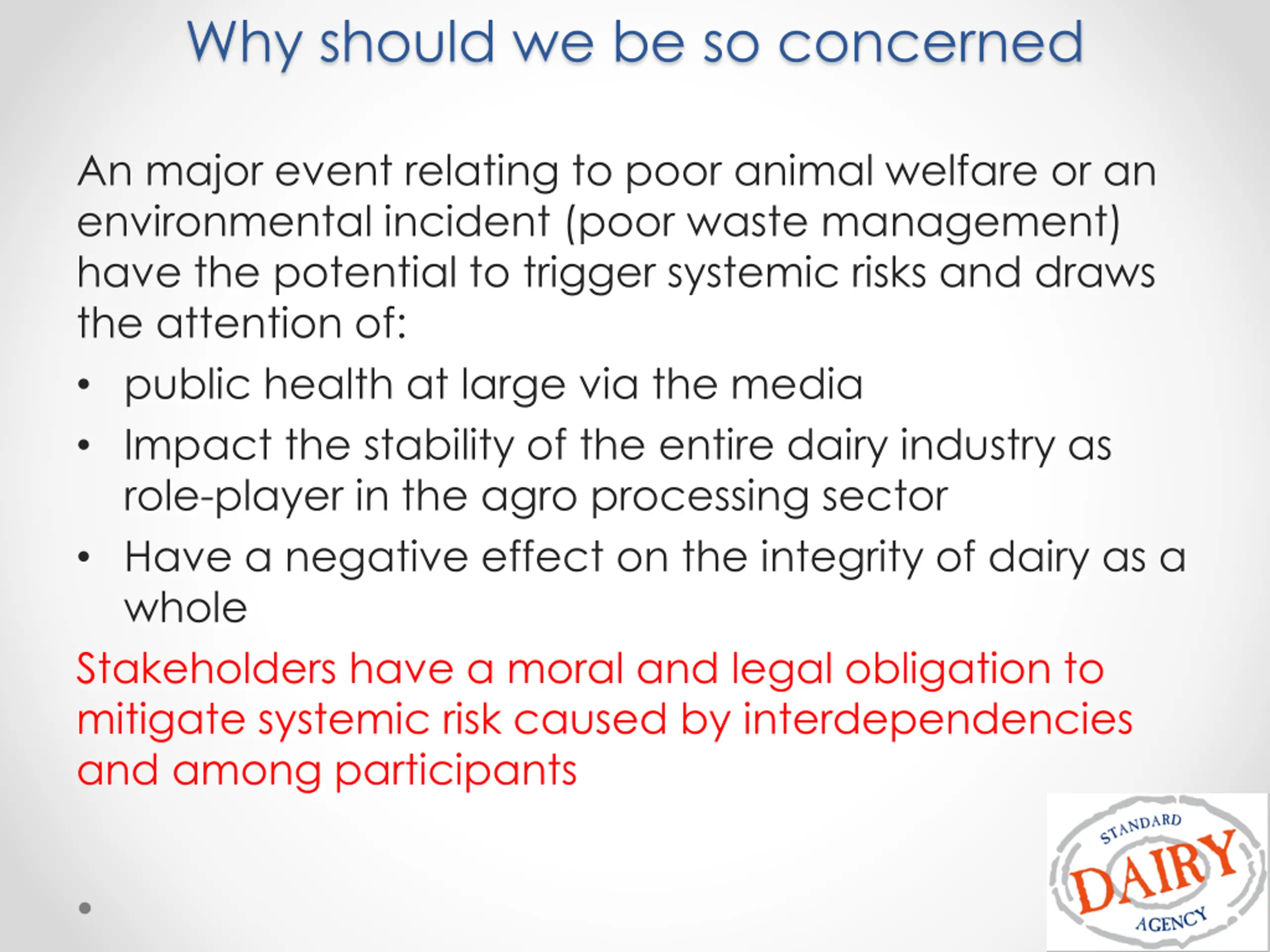 Why should we be so concerned An major event relating to poor animal welfare or an environmental incident (poor waste management) have the potential to trigger systemic risks and draws the attention of: public health at large via the media Impact the stability of the entire dairy industry as role-player in the agro processing sector Have a negative effect on the integrity of dairy as a whole Stakeholders have a moral and legal obligation to mitigate systemic risk caused by interdependencies and among participants