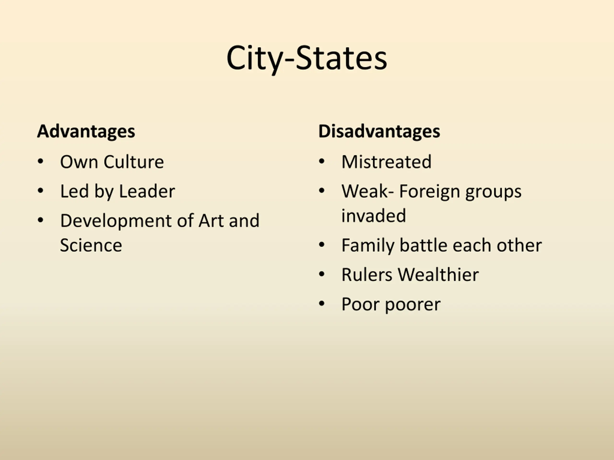 City-States Advantages Own Culture Led by Leader Development of Art and Science Disadvantages Mistreated Weak- Foreign groups invaded Family battle each other Rulers Wealthier Poor poorer