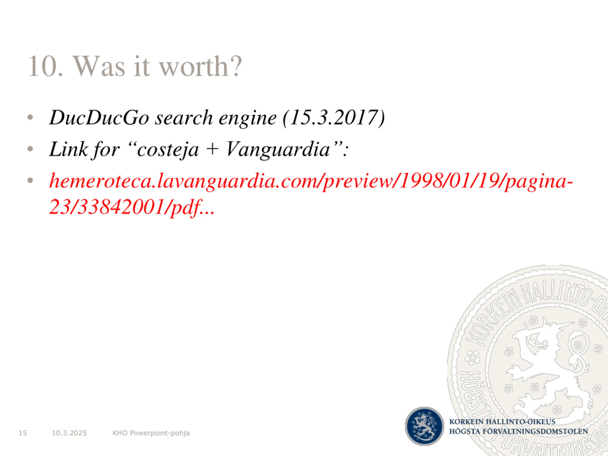 10. Was it worth? DucDucGo search engine (15.3.2017) Link for costeja + Vanguardia : hemeroteca.lavanguardia.com/preview/1998/01/19/pagina- 23/33842001/pdf... 15 10.3.2025 KHO Powerpoint-pohja