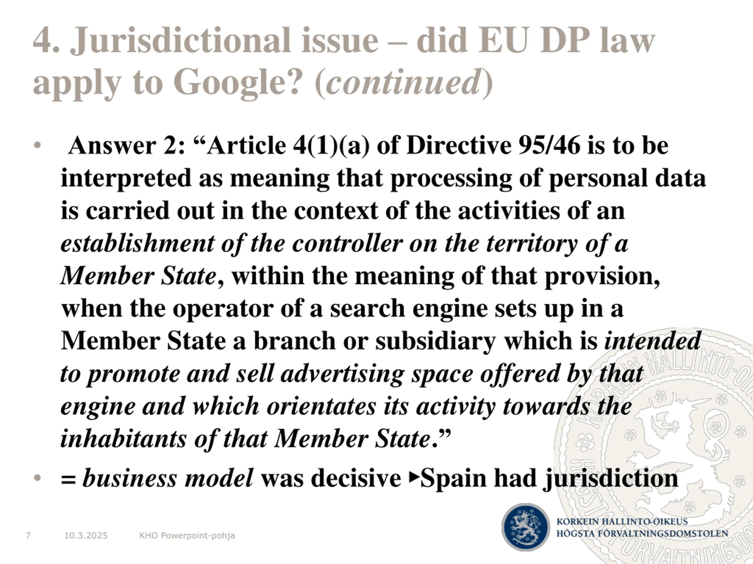 4. Jurisdictional issue did EU DP law apply to Google? (continued) Answer 2: Article 4(1)(a) of Directive 95/46 is to be interpreted as meaning that processing of personal data is carried out in the context of the activities of an establishment of the controller on the territory of a Member State, within the meaning of that provision, when the operator of a search engine sets up in a Member State a branch or subsidiary which is intended to promote and sell advertising space offered by that engine and which orientates its activity towards the inhabitants of that Member State. = business model was decisive Spain had jurisdiction 7 10.3.2025 KHO Powerpoint-pohja