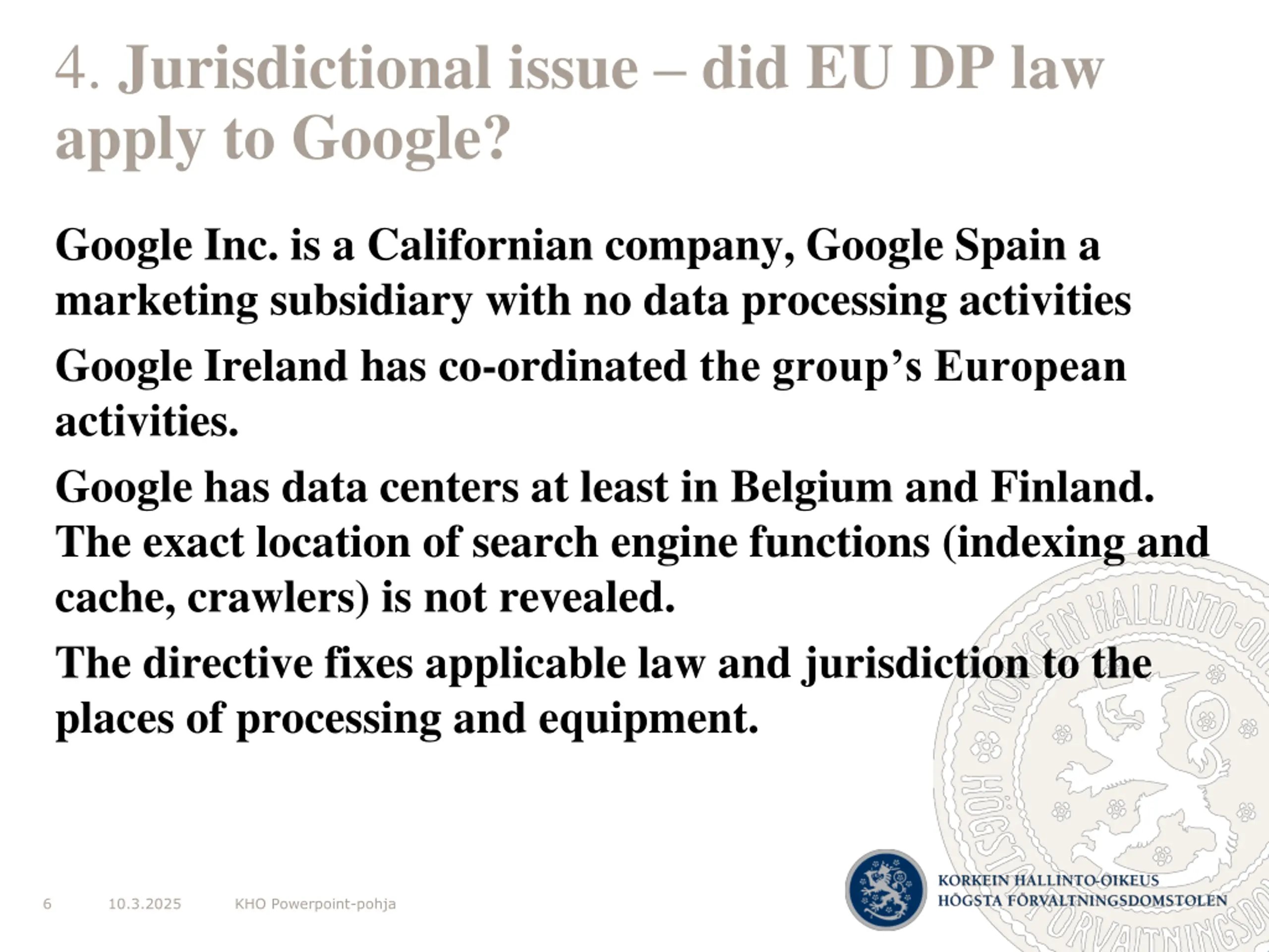 4. Jurisdictional issue did EU DP law apply to Google? Google Inc. is a Californian company, Google Spain a marketing subsidiary with no data processing activities Google Ireland has co-ordinated the group s European activities. Google has data centers at least in Belgium and Finland. The exact location of search engine functions (indexing and cache, crawlers) is not revealed. The directive fixes applicable law and jurisdiction to the places of processing and equipment. 6 10.3.2025 KHO Powerpoint-pohja