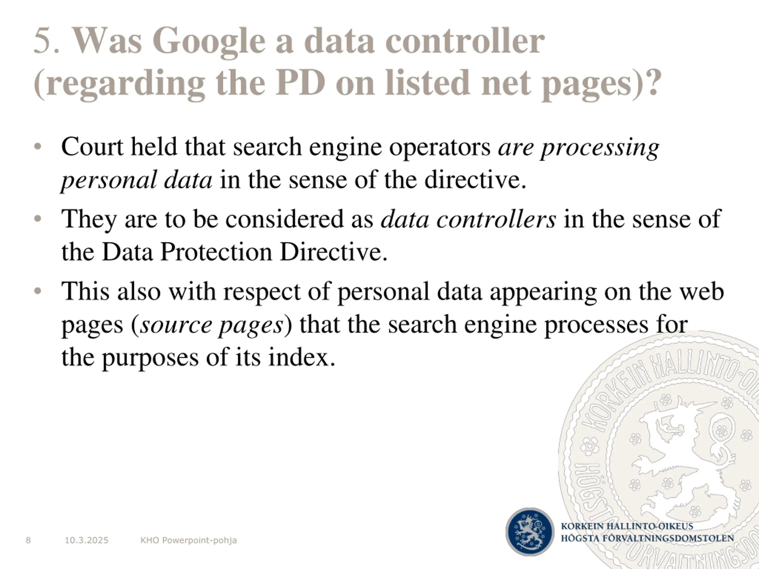 5. Was Google a data controller (regarding the PD on listed net pages)? Court held that search engine operators are processing personal data in the sense of the directive. They are to be considered as data controllers in the sense of the Data Protection Directive. This also with respect of personal data appearing on the web pages (source pages) that the search engine processes for the purposes of its index. 8 10.3.2025 KHO Powerpoint-pohja