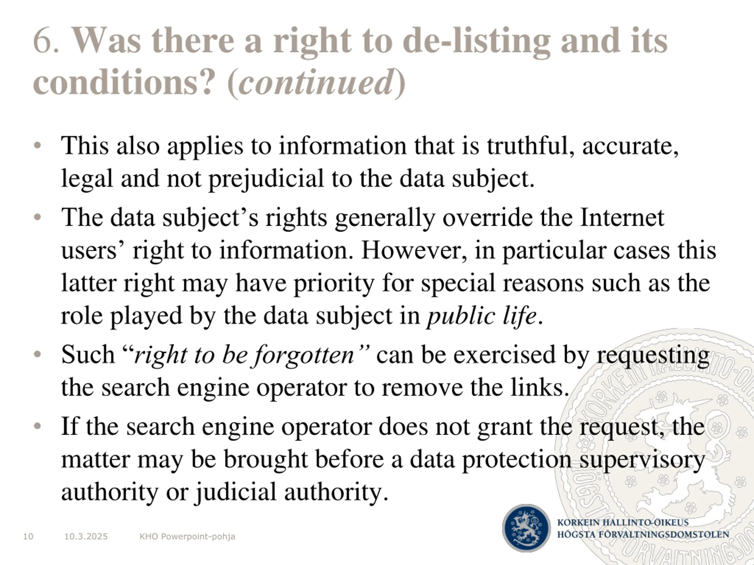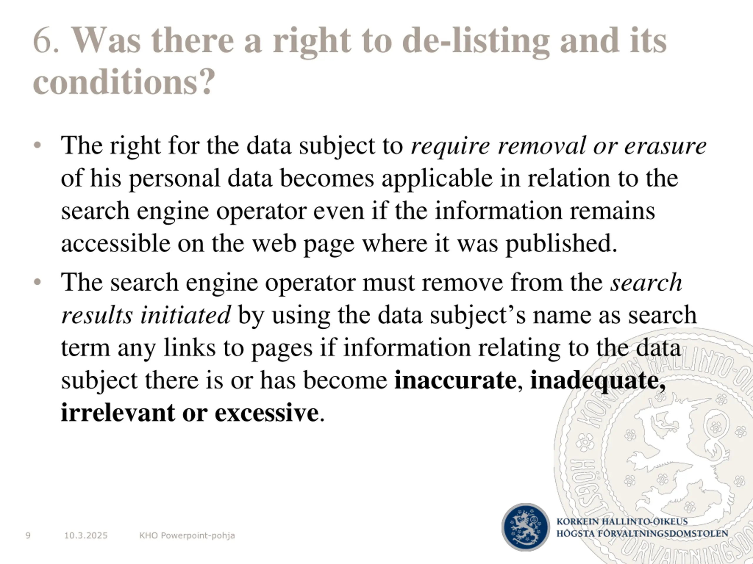 6. Was there a right to de-listing and its conditions? The right for the data subject to require removal or erasure of his personal data becomes applicable in relation to the search engine operator even if the information remains accessible on the web page where it was published. The search engine operator must remove from the search results initiated by using the data subject s name as search term any links to pages if information relating to the data subject there is or has become inaccurate, inadequate, irrelevant or excessive. 9 10.3.2025 KHO Powerpoint-pohja