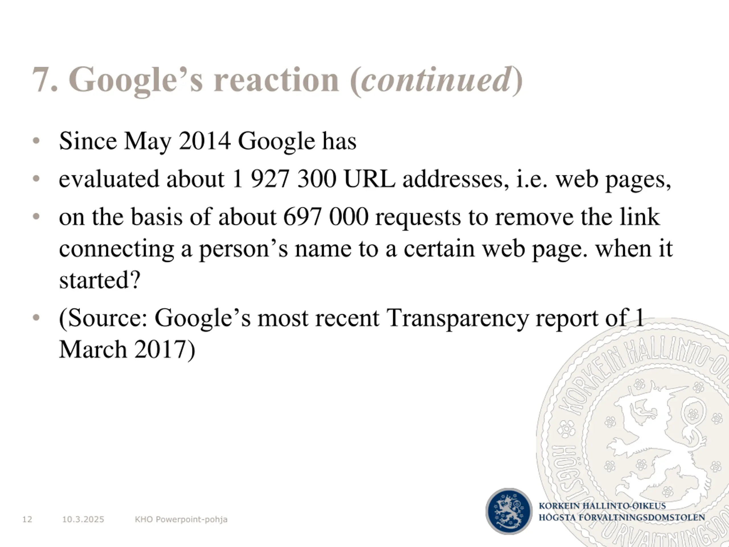 7. Googles reaction (continued) Since May 2014 Google has evaluated about 1 927 300 URL addresses, i.e. web pages, on the basis of about 697 000 requests to remove the link connecting a person s name to a certain web page. when it started? (Source: Google s most recent Transparency report of 1 March 2017) 12 10.3.2025 KHO Powerpoint-pohja