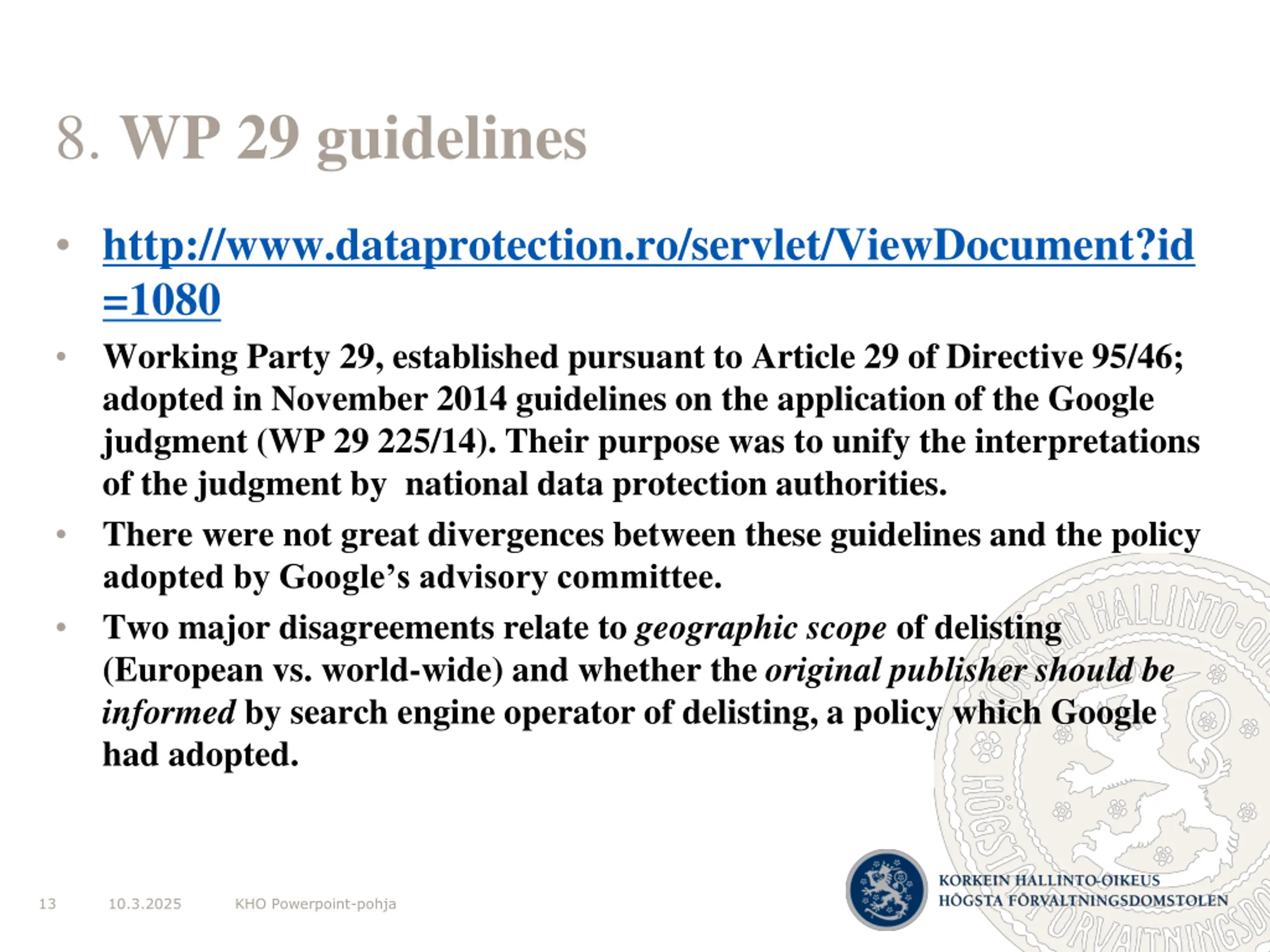 8. WP 29 guidelines http://www.dataprotection.ro/servlet/ViewDocument?id =1080 Working Party 29, established pursuant to Article 29 of Directive 95/46; adopted in November 2014 guidelines on the application of the Google judgment (WP 29 225/14). Their purpose was to unify the interpretations of the judgment by national data protection authorities. There were not great divergences between these guidelines and the policy adopted by Google s advisory committee. Two major disagreements relate to geographic scope of delisting (European vs. world-wide) and whether the original publisher should be informed by search engine operator of delisting, a policy which Google had adopted. 13 10.3.2025 KHO Powerpoint-pohja