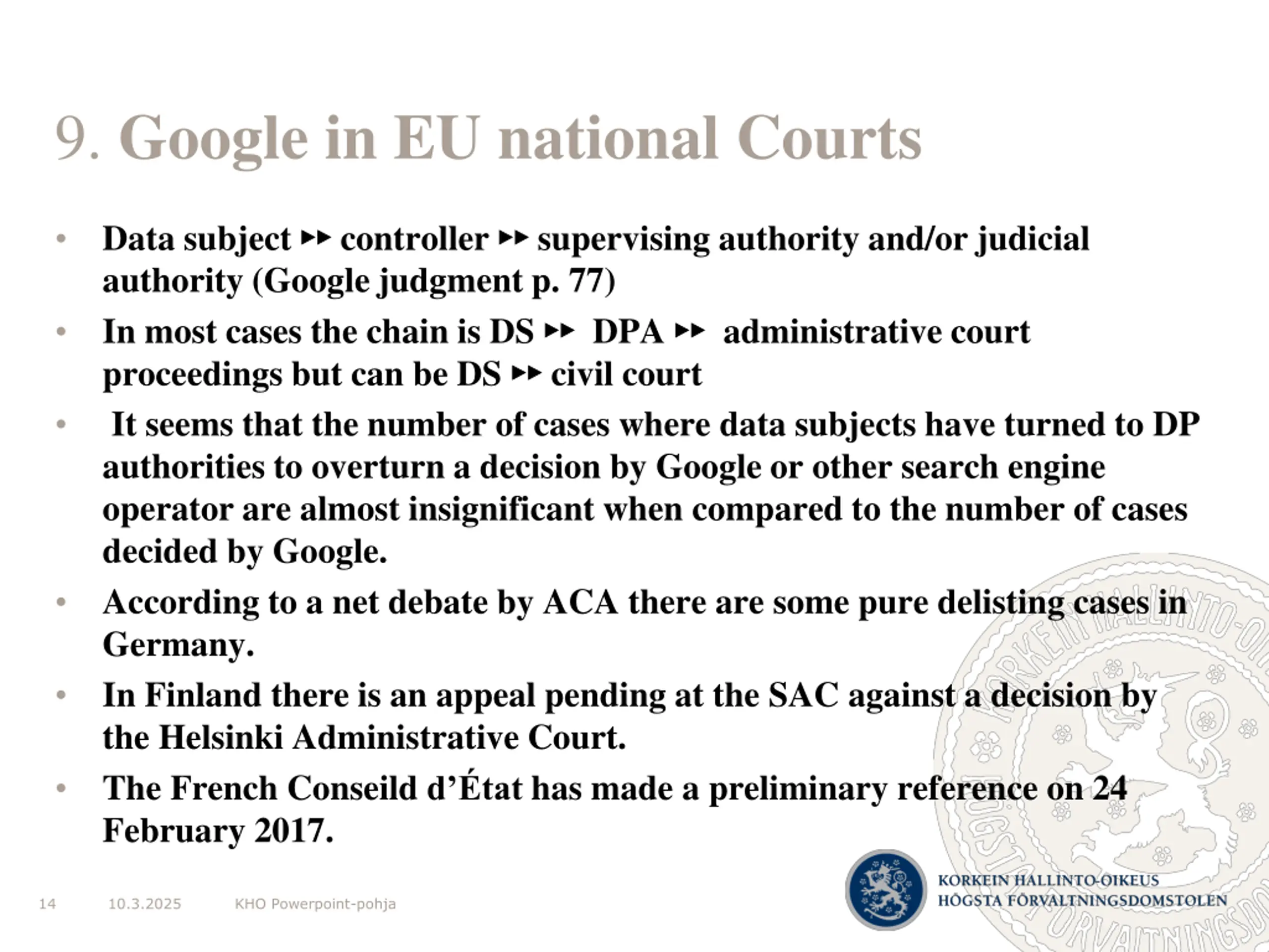 9. Google in EU national Courts Data subject controller supervising authority and/or judicial authority (Google judgment p. 77) In most cases the chain is DS DPA administrative court proceedings but can be DS civil court It seems that the number of cases where data subjects have turned to DP authorities to overturn a decision by Google or other search engine operator are almost insignificant when compared to the number of cases decided by Google. According to a net debate by ACA there are some pure delisting cases in Germany. In Finland there is an appeal pending at the SAC against a decision by the Helsinki Administrative Court. The French Conseild d tat has made a preliminary reference on 24 February 2017. 14 10.3.2025 KHO Powerpoint-pohja