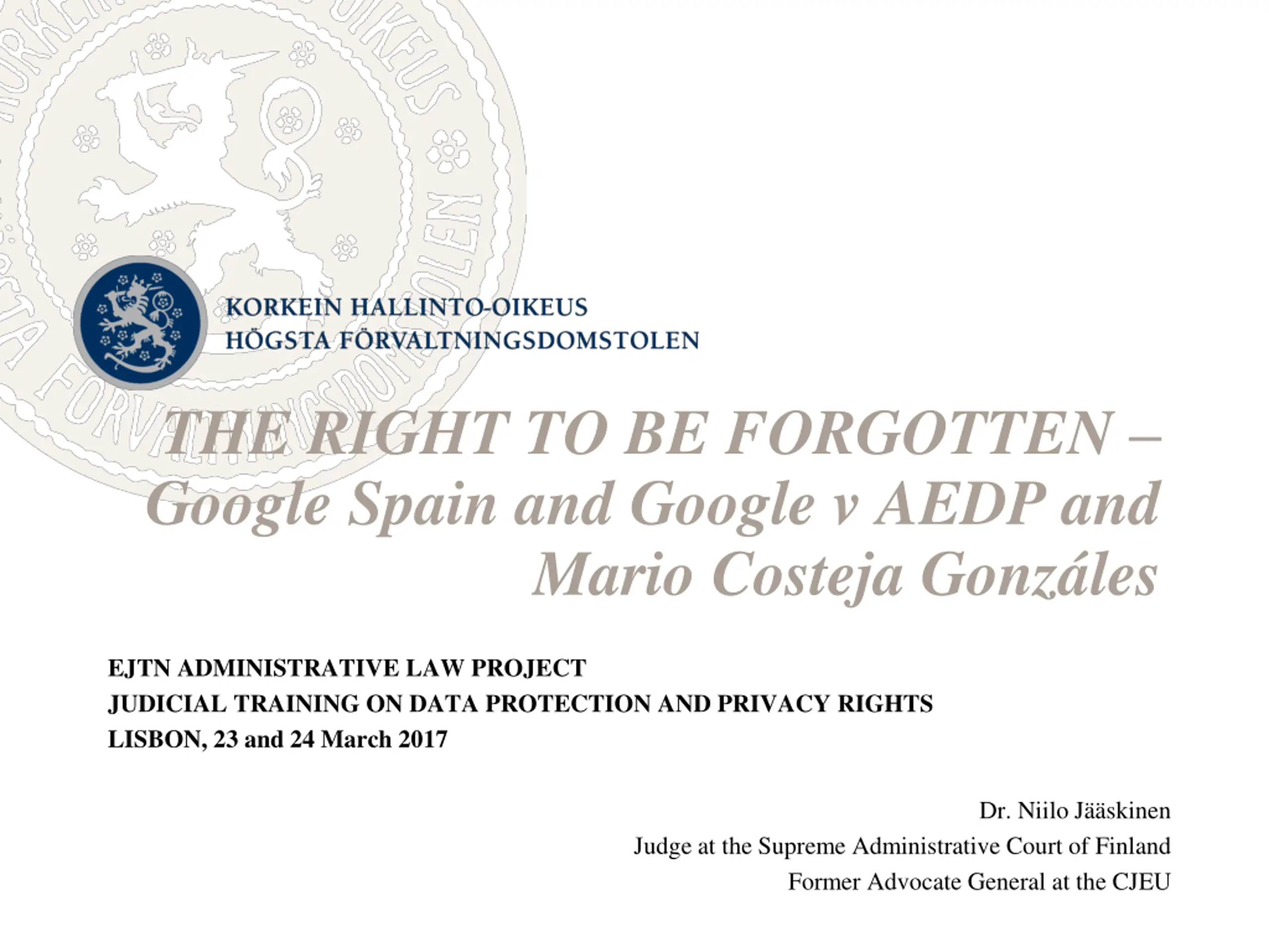 THE RIGHT TO BE FORGOTTEN Google Spain and Google v AEDP and Mario Costeja Gonz les EJTN ADMINISTRATIVE LAW PROJECT JUDICIAL TRAINING ON DATA PROTECTION AND PRIVACY RIGHTS LISBON, 23 and 24 March 2017 Dr. Niilo J skinen Judge at the Supreme Administrative Court of Finland Former Advocate General at the CJEU
