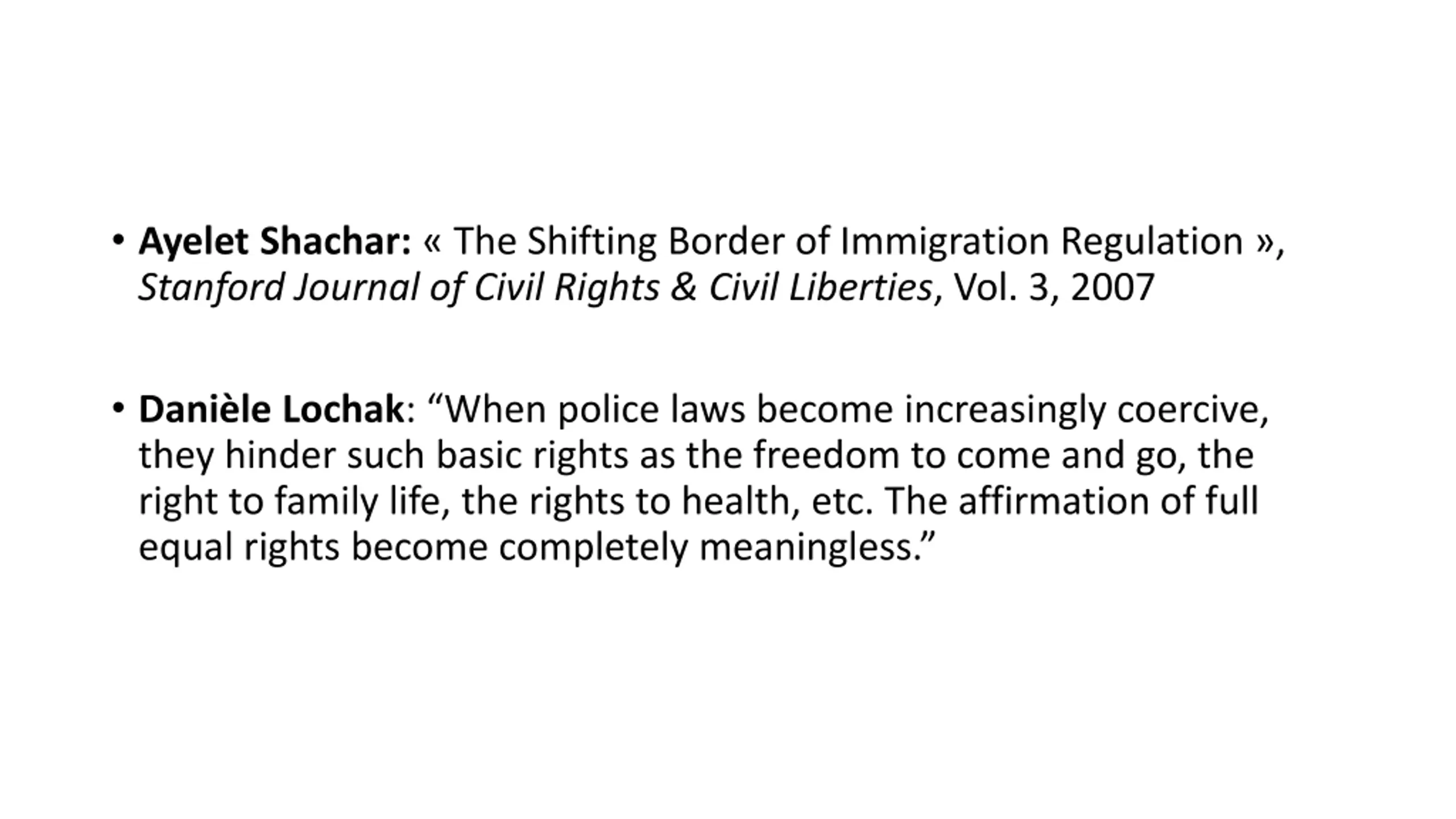Ayelet Shachar: The Shifting Border of Immigration Regulation , Stanford Journal of Civil Rights & Civil Liberties, Vol. 3, 2007 Dani le Lochak: When police laws become increasingly coercive, they hinder such basic rights as the freedom to come and go, the right to family life, the rights to health, etc. The affirmation of full equal rights become completely meaningless.