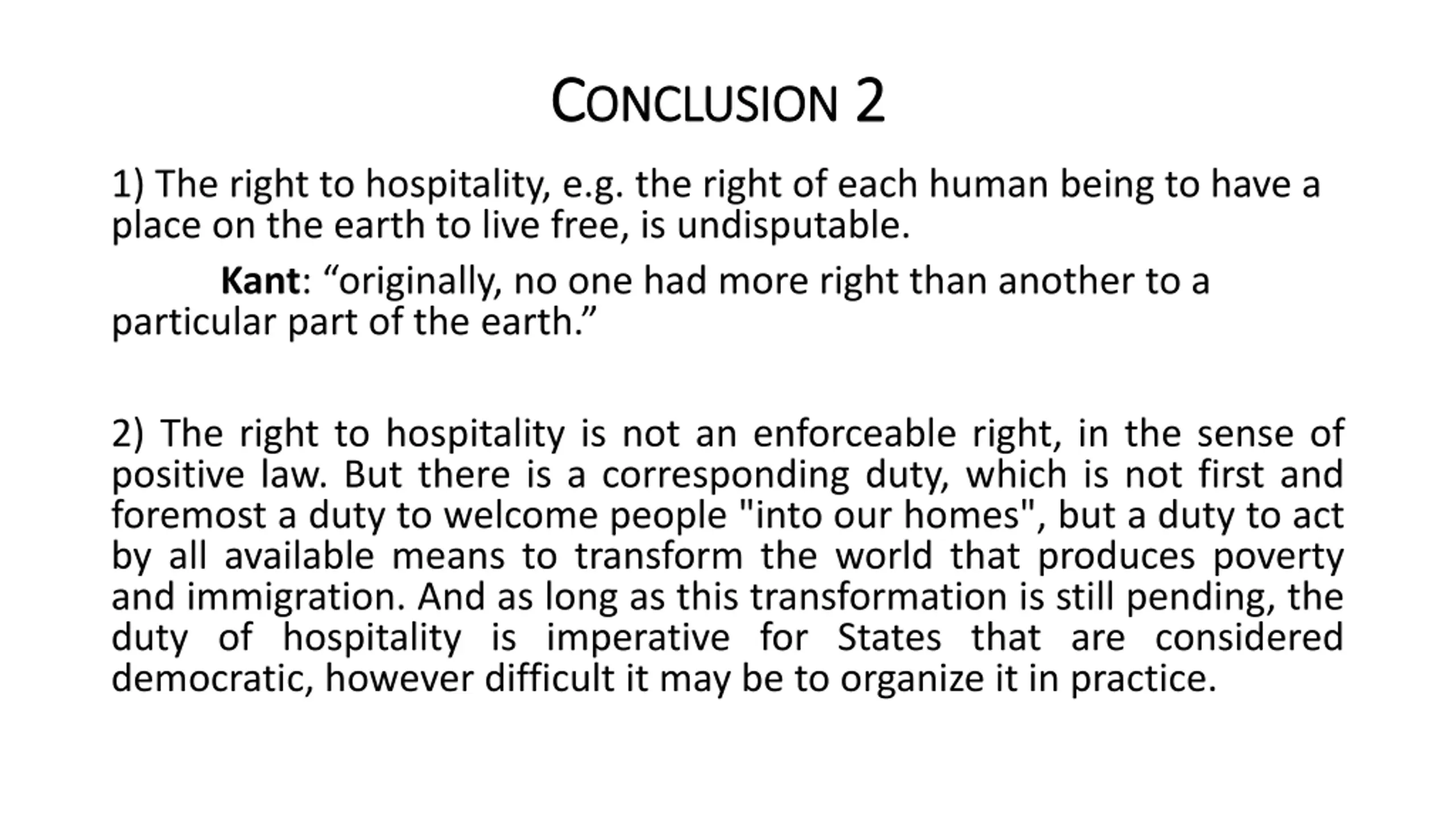 C CONCLUSION ONCLUSION 2 2 1) The right to hospitality, e.g. the right of each human being to have a place on the earth to live free, is undisputable. Kant: originally, no one had more right than another to a particular part of the earth. 2) The right to hospitality is not an enforceable right, in the sense of positive law. But there is a corresponding duty, which is not first and foremost a duty to welcome people "into our homes", but a duty to act by all available means to transform the world that produces poverty and immigration. And as long as this transformation is still pending, the duty of hospitality is imperative for States that are considered democratic, however difficult it may be to organize it in practice.