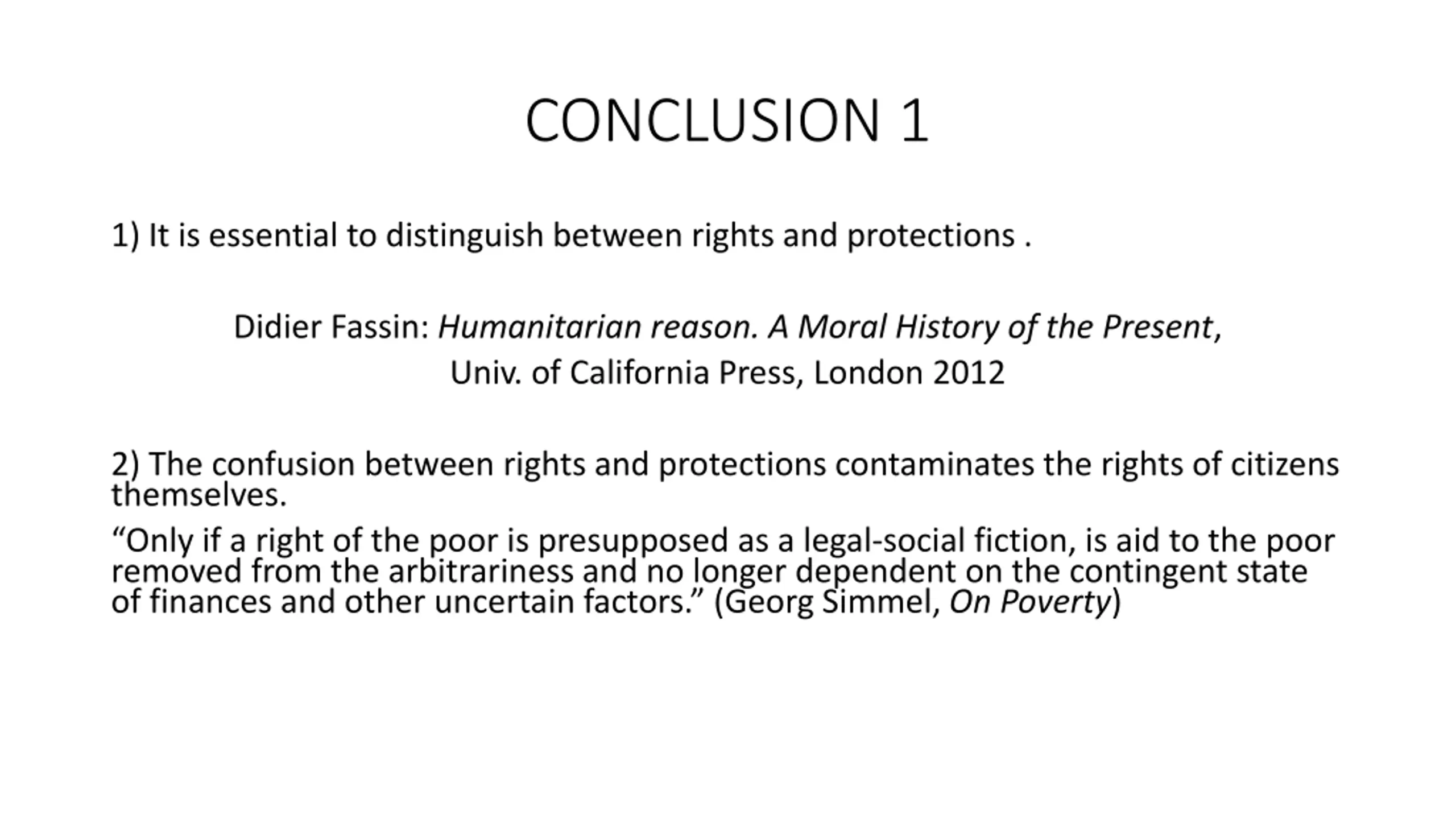 CONCLUSION 1 1) It is essential to distinguish between rights and protections . Didier Fassin: Humanitarian reason. A Moral History of the Present, Univ. of California Press, London 2012 2) The confusion between rights and protections contaminates the rights of citizens themselves. Only if a right of the poor is presupposed as a legal-social fiction, is aid to the poor removed from the arbitrariness and no longer dependent on the contingent state of finances and other uncertain factors. (Georg Simmel, On Poverty)
