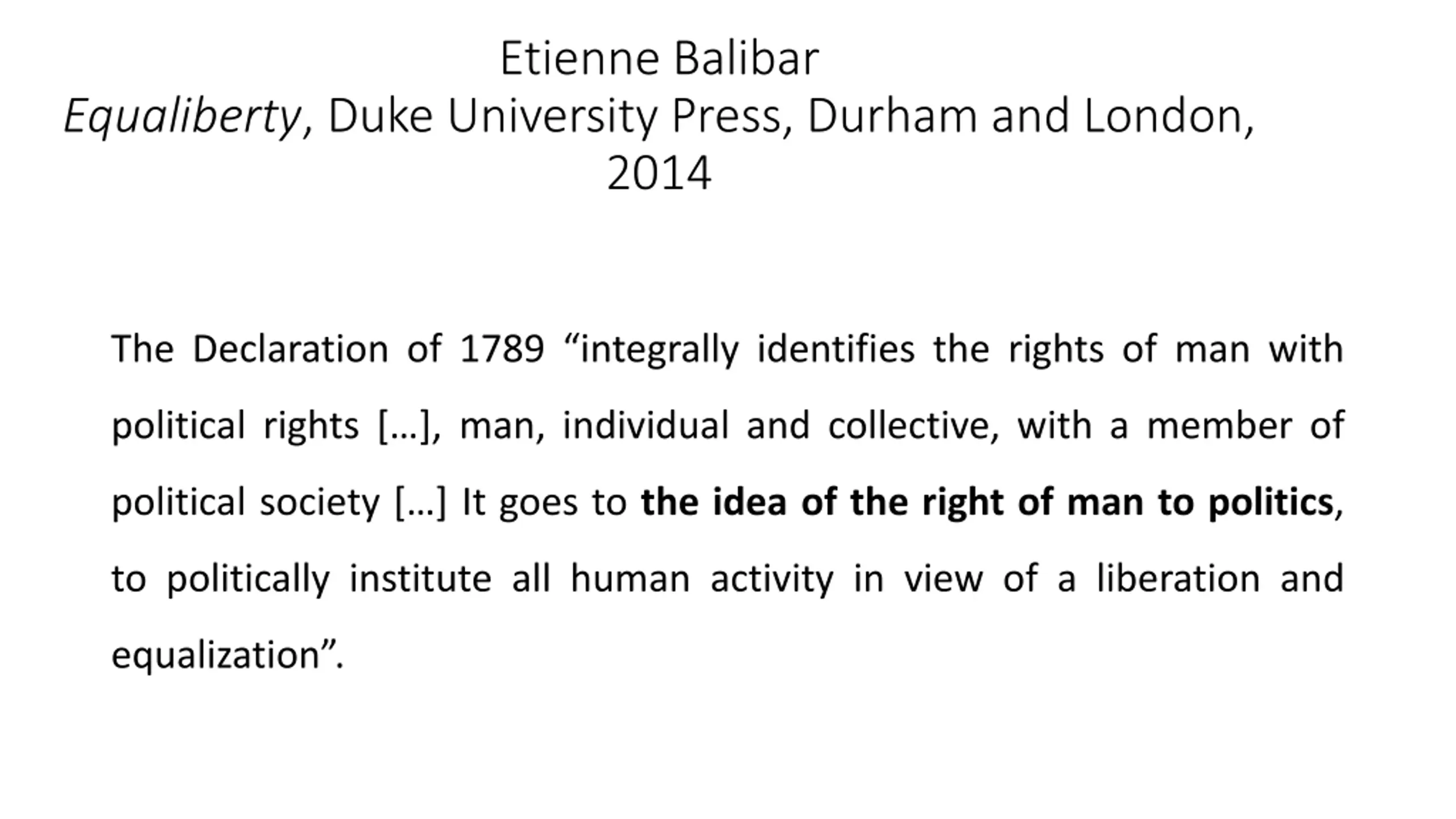 Etienne Balibar Equaliberty, Duke University Press, Durham and London, 2014 The Declaration of 1789 integrally identifies the rights of man with political rights [ ], man, individual and collective, with a member of political society [ ] It goes to the idea of the right of man to politics, to politically institute all human activity in view of a liberation and equalization .