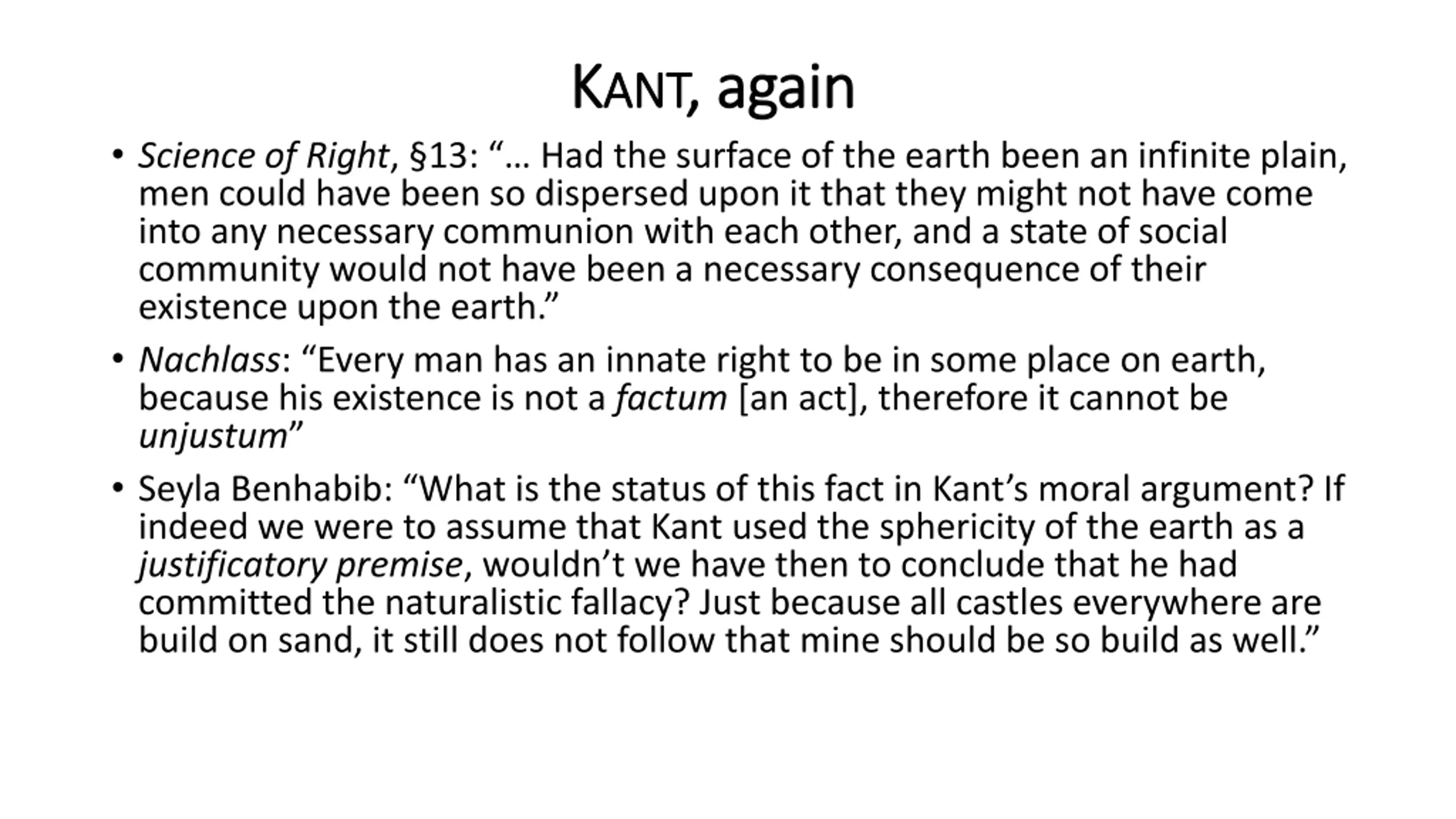 K KANT ANT, , again again Science of Right, 13: Had the surface of the earth been an infinite plain, men could have been so dispersed upon it that they might not have come into any necessary communion with each other, and a state of social community would not have been a necessary consequence of their existence upon the earth. Nachlass: Every man has an innate right to be in some place on earth, because his existence is not a factum [an act], therefore it cannot be unjustum Seyla Benhabib: What is the status of this fact in Kant s moral argument? If indeed we were to assume that Kant used the sphericity of the earth as a justificatory premise, wouldn t we have then to conclude that he had committed the naturalistic fallacy? Just because all castles everywhere are build on sand, it still does not follow that mine should be so build as well.