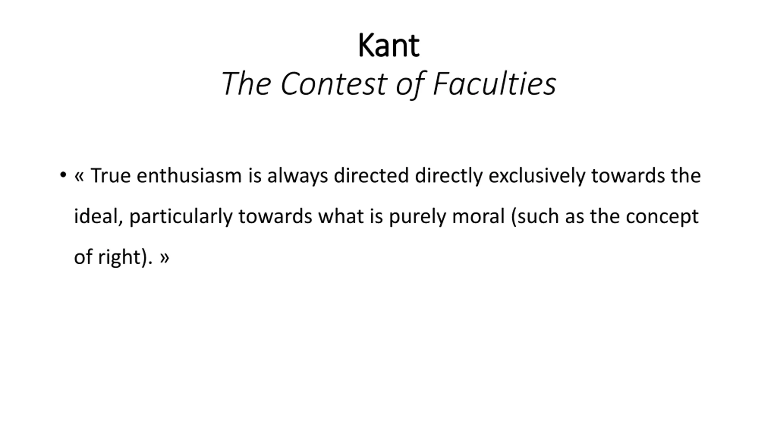 Kant Kant The Contest of Faculties True enthusiasm is always directed directly exclusively towards the ideal, particularly towards what is purely moral (such as the concept of right).