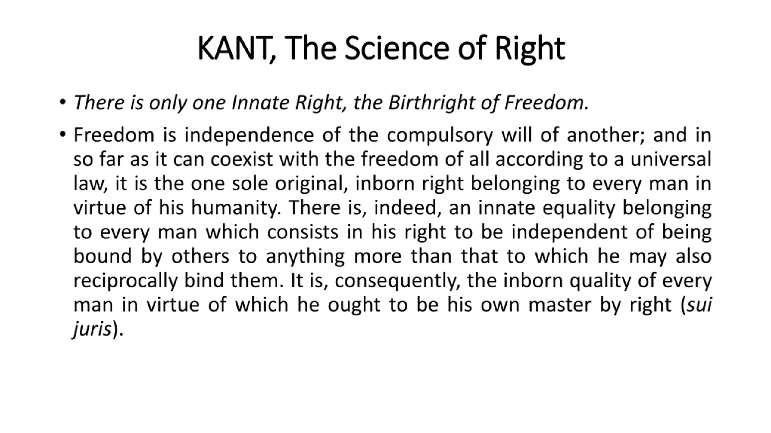 KANT, The Science of Right KANT, The Science of Right There is only one Innate Right, the Birthright of Freedom. Freedom is independence of the compulsory will of another; and in so far as it can coexist with the freedom of all according to a universal law, it is the one sole original, inborn right belonging to every man in virtue of his humanity. There is, indeed, an innate equality belonging to every man which consists in his right to be independent of being bound by others to anything more than that to which he may also reciprocally bind them. It is, consequently, the inborn quality of every man in virtue of which he ought to be his own master by right (sui juris).