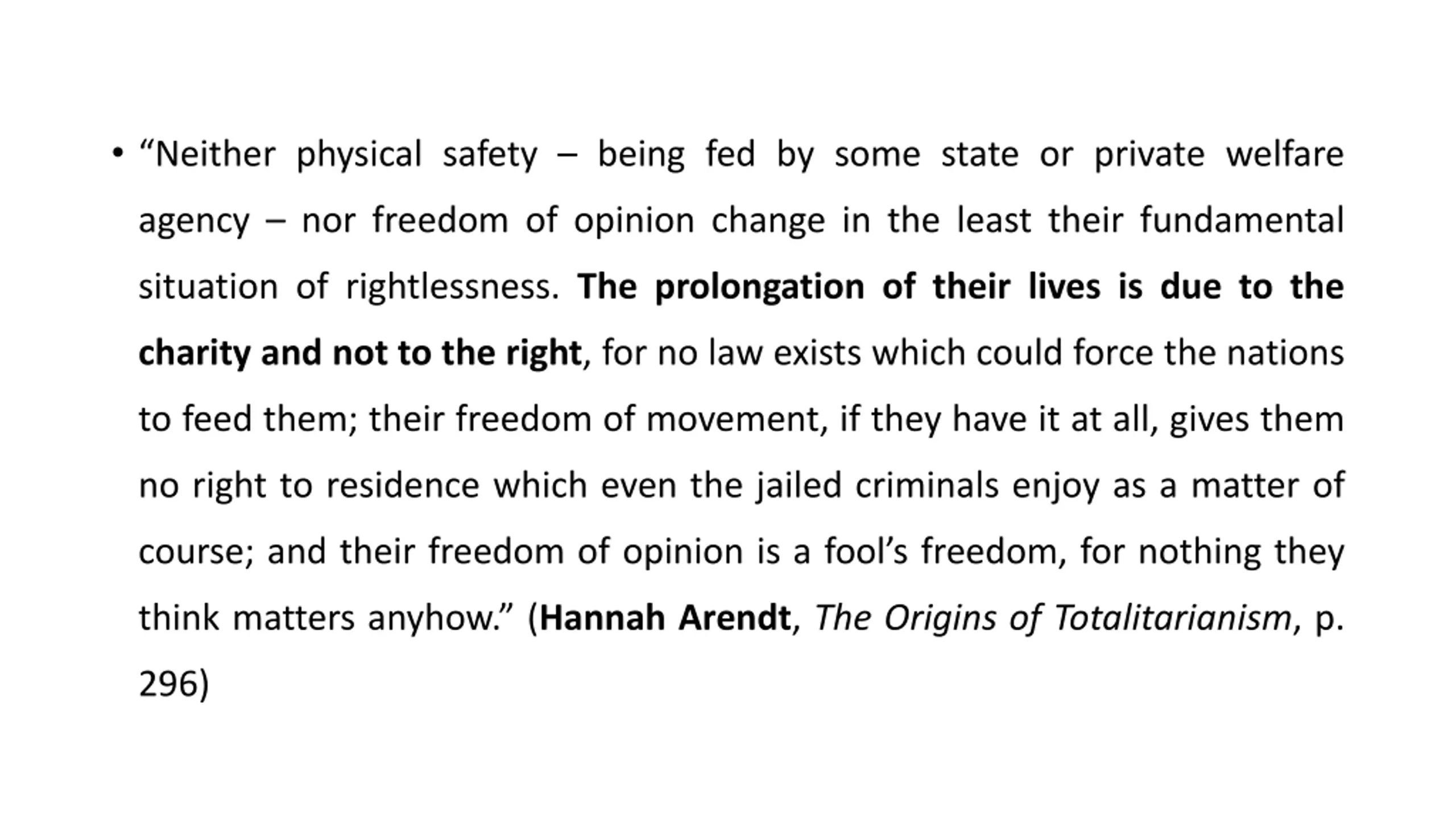 Neither physical safety being fed by some state or private welfare agency nor freedom of opinion change in the least their fundamental situation of rightlessness. The prolongation of their lives is due to the charity and not to the right, for no law exists which could force the nations to feed them; their freedom of movement, if they have it at all, gives them no right to residence which even the jailed criminals enjoy as a matter of course; and their freedom of opinion is a fool s freedom, for nothing they think matters anyhow. (Hannah Arendt, The Origins of Totalitarianism, p. 296)