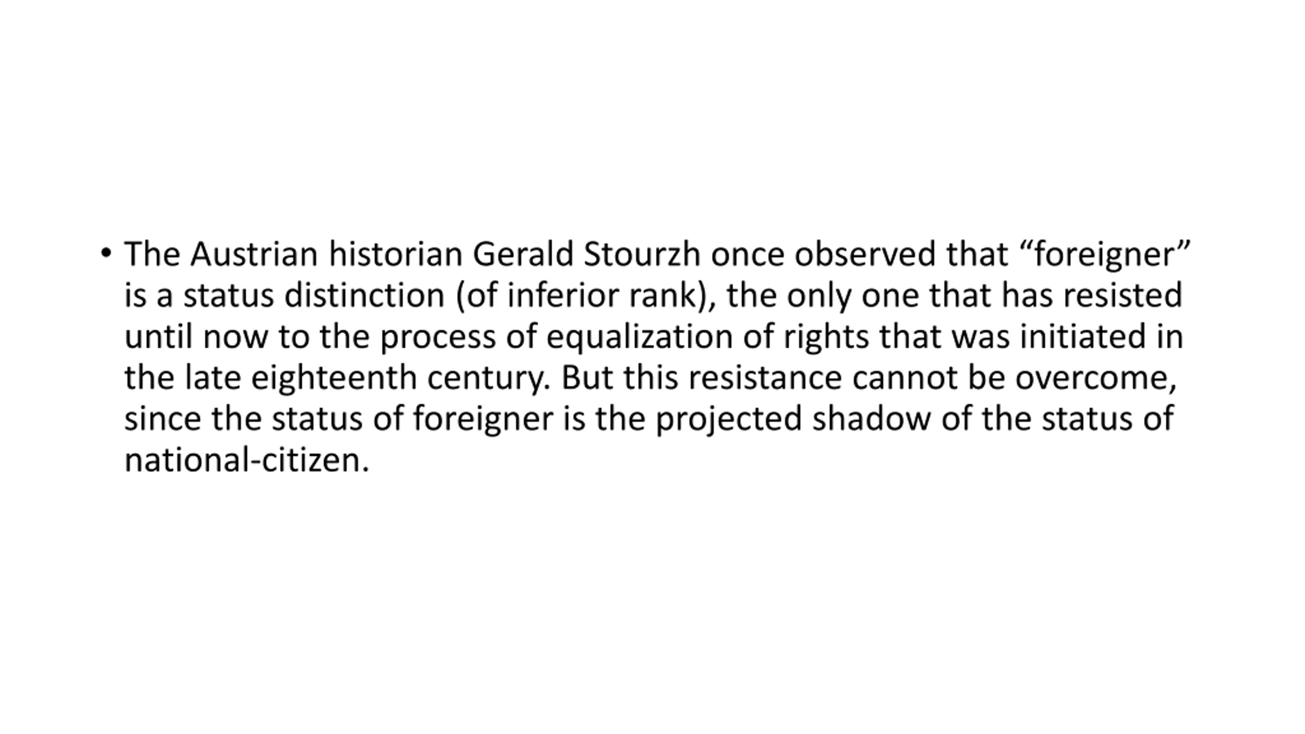 The Austrian historian Gerald Stourzh once observed that foreigner is a status distinction (of inferior rank), the only one that has resisted until now to the process of equalization of rights that was initiated in the late eighteenth century. But this resistance cannot be overcome, since the status of foreigner is the projected shadow of the status of national-citizen.