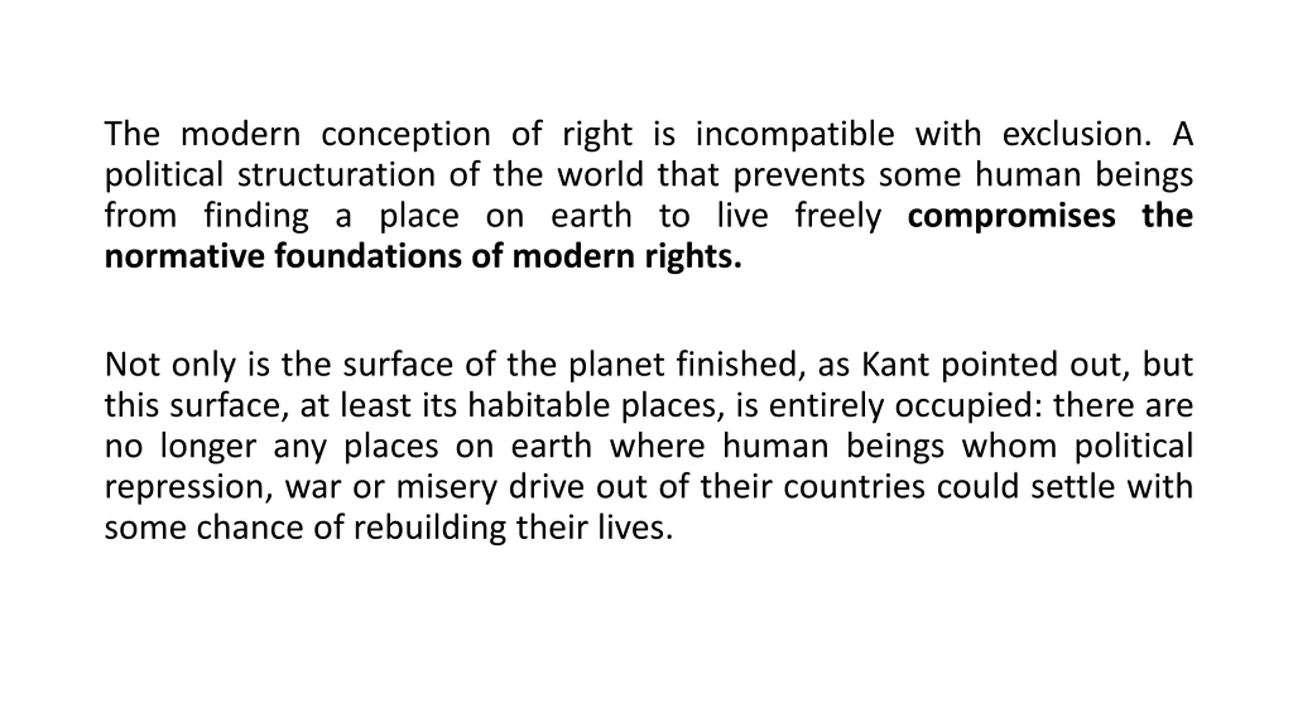 The modern conception of right is incompatible with exclusion. A political structuration of the world that prevents some human beings from finding a place on earth to live freely compromises the normative foundations of modern rights. Not only is the surface of the planet finished, as Kant pointed out, but this surface, at least its habitable places, is entirely occupied: there are no longer any places on earth where human beings whom political repression, war or misery drive out of their countries could settle with some chance of rebuilding their lives.