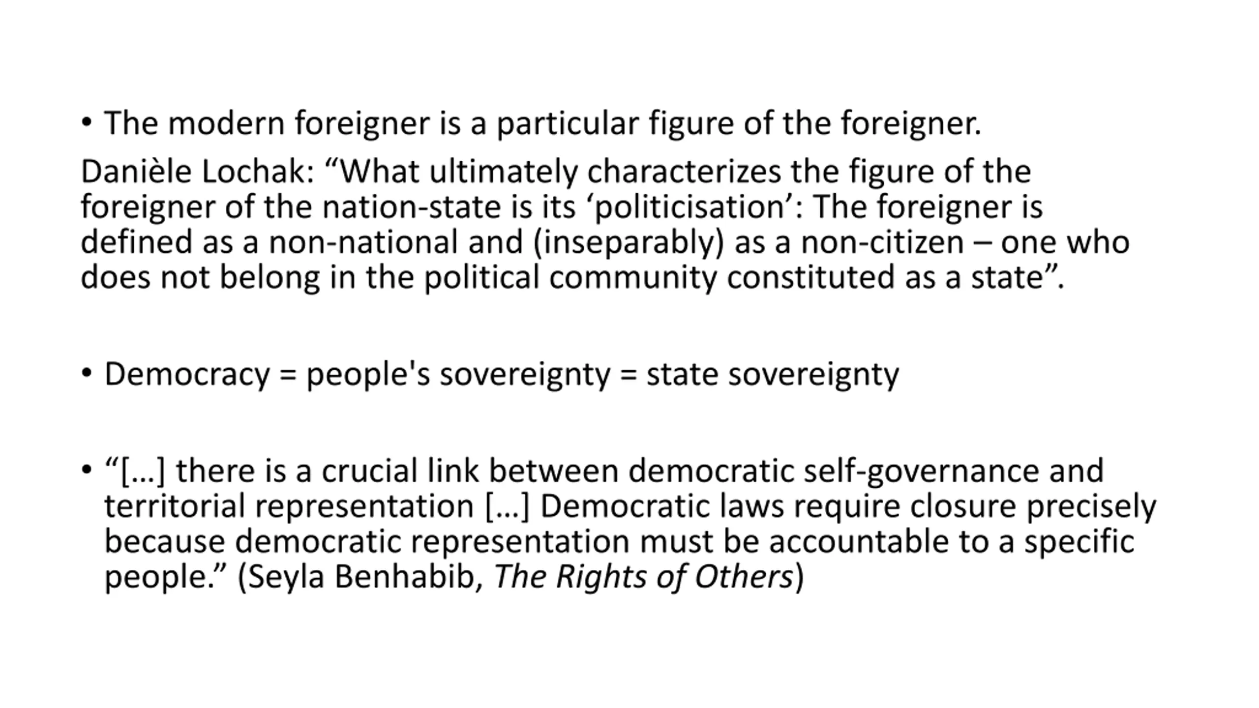 The modern foreigner is a particular figure of the foreigner. Dani le Lochak: What ultimately characterizes the figure of the foreigner of the nation-state is its politicisation : The foreigner is defined as a non-national and (inseparably) as a non-citizen one who does not belong in the political community constituted as a state . Democracy = people's sovereignty = state sovereignty [ ] there is a crucial link between democratic self-governance and territorial representation [ ] Democratic laws require closure precisely because democratic representation must be accountable to a specific people. (Seyla Benhabib, The Rights of Others)