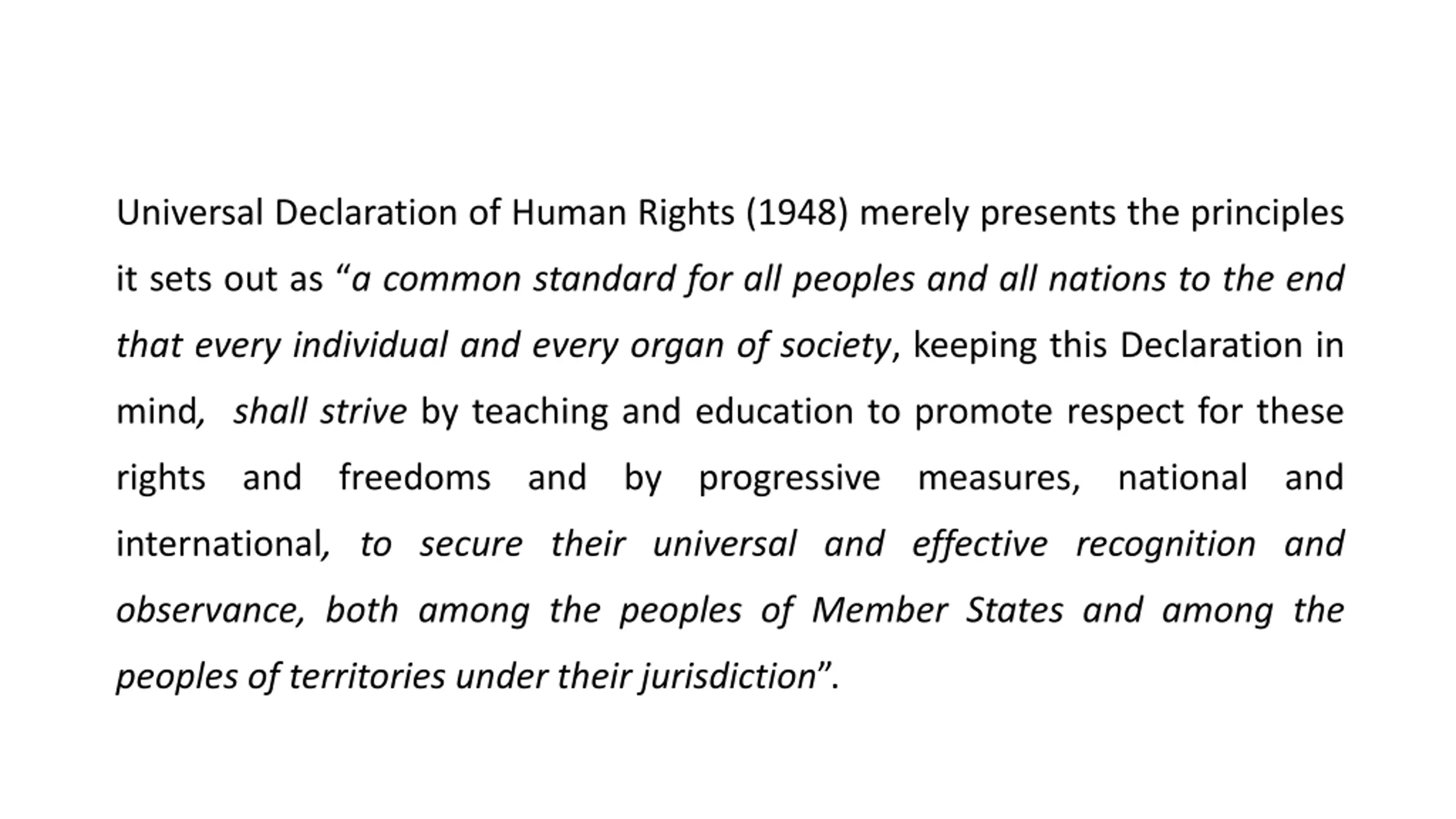 Universal Declaration of Human Rights (1948) merely presents the principles it sets out as a common standard for all peoples and all nations to the end that every individual and every organ of society, keeping this Declaration in mind, shall strive by teaching and education to promote respect for these rights and freedoms and by progressive measures, national and international, to secure their universal and effective recognition and observance, both among the peoples of Member States and among the peoples of territories under their jurisdiction .