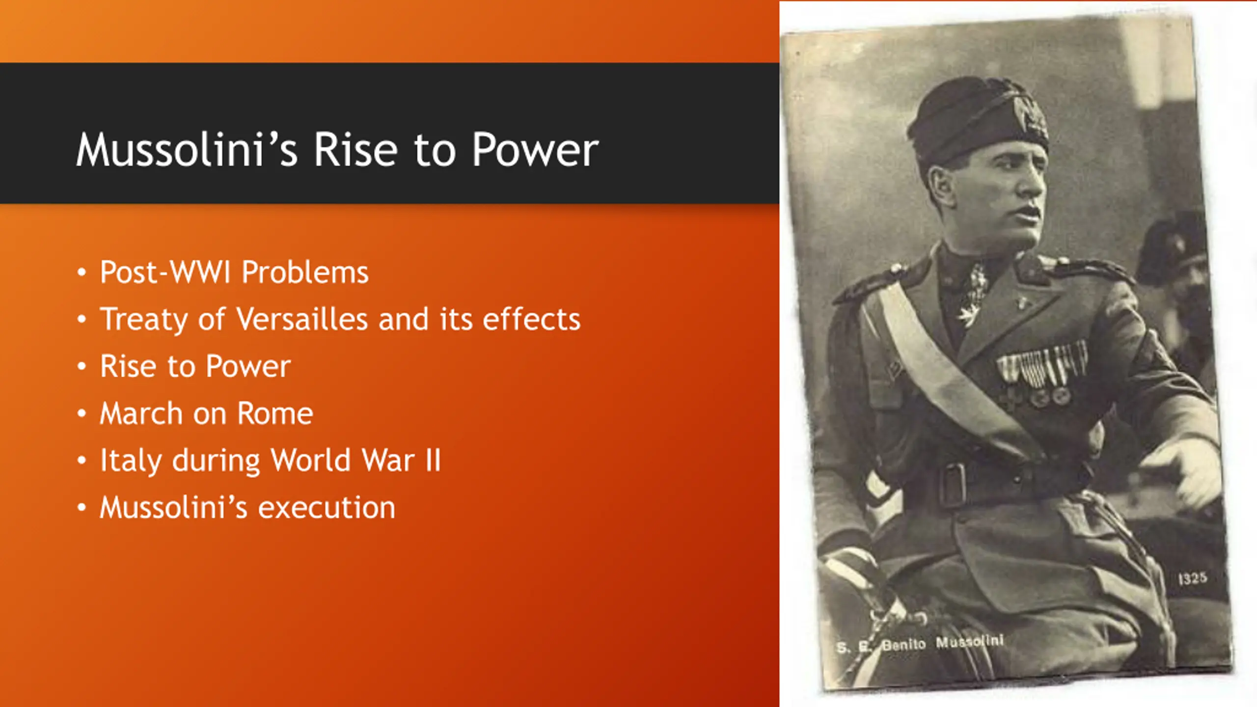 Mussolinis Rise to Power Post-WWI Problems Treaty of Versailles and its effects Rise to Power March on Rome Italy during World War II Mussolini s execution