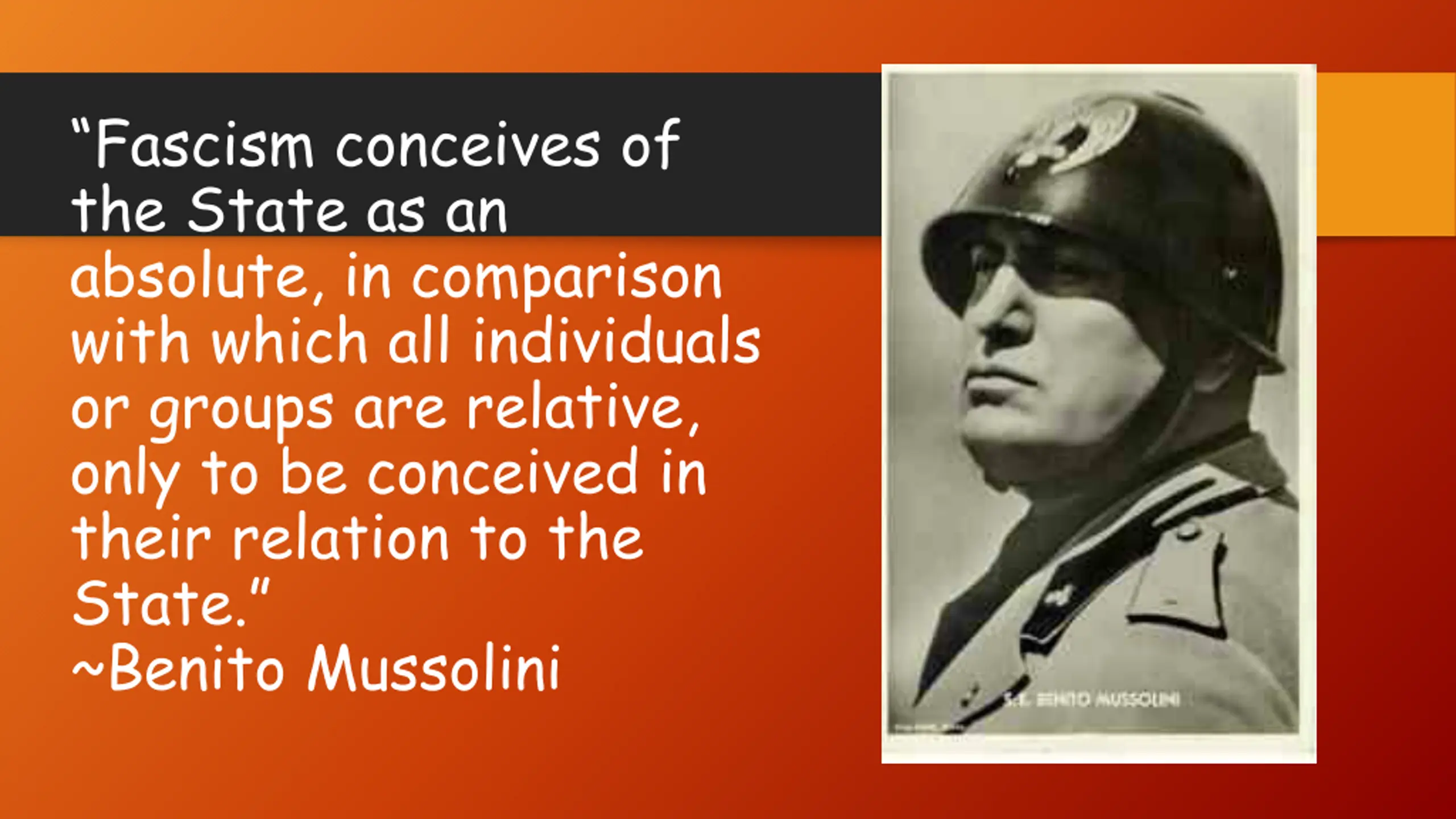 [Postkarte: Benito Mussolini, 1937] Fascism conceives of the State as an absolute, in comparison with which all individuals or groups are relative, only to be conceived in their relation to the State. ~Benito Mussolini