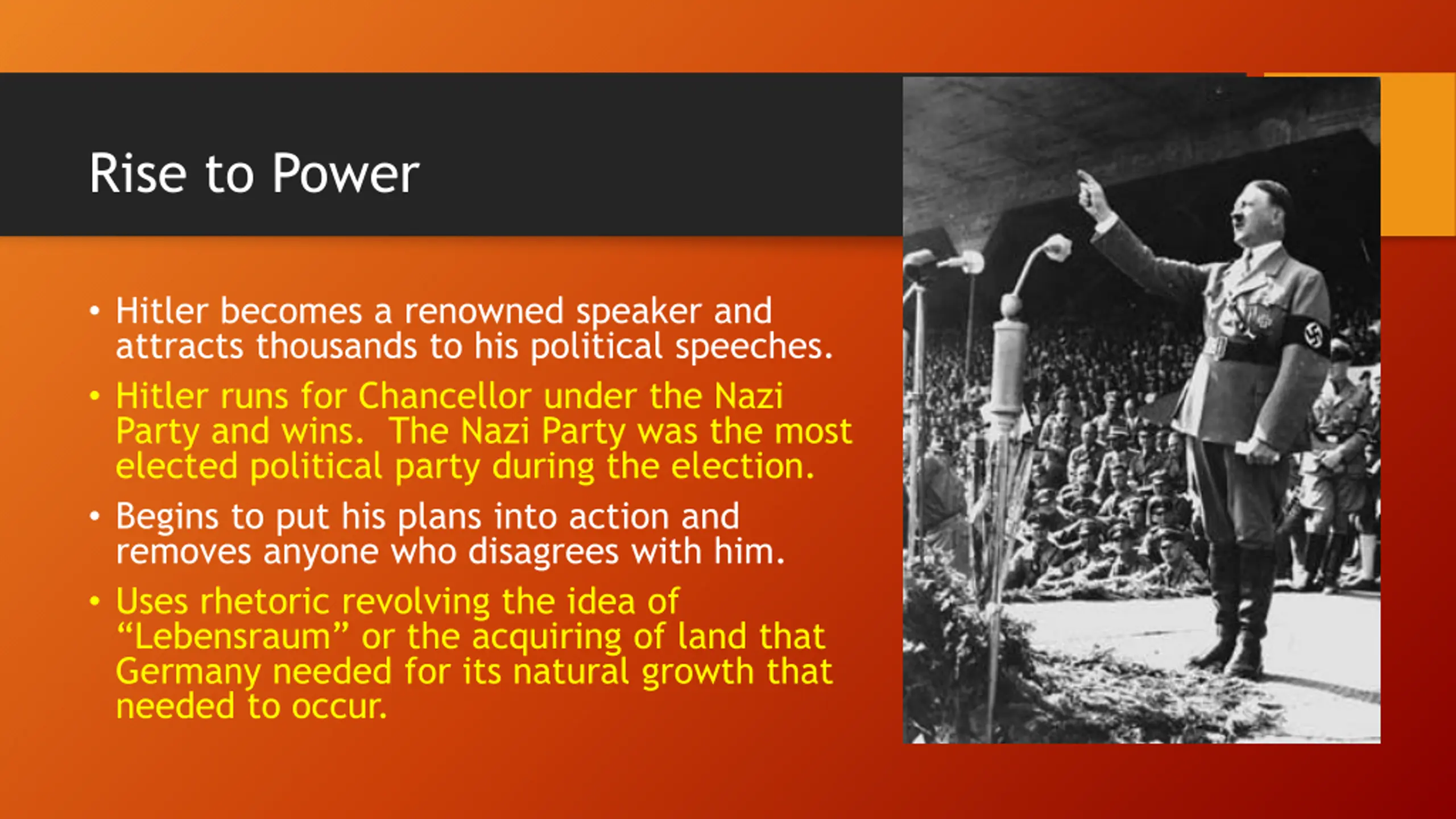 Rise to Power Hitler becomes a renowned speaker and attracts thousands to his political speeches. Hitler runs for Chancellor under the Nazi Party and wins. The Nazi Party was the most elected political party during the election. Begins to put his plans into action and removes anyone who disagrees with him. Uses rhetoric revolving the idea of Lebensraum or the acquiring of land that Germany needed for its natural growth that needed to occur.
