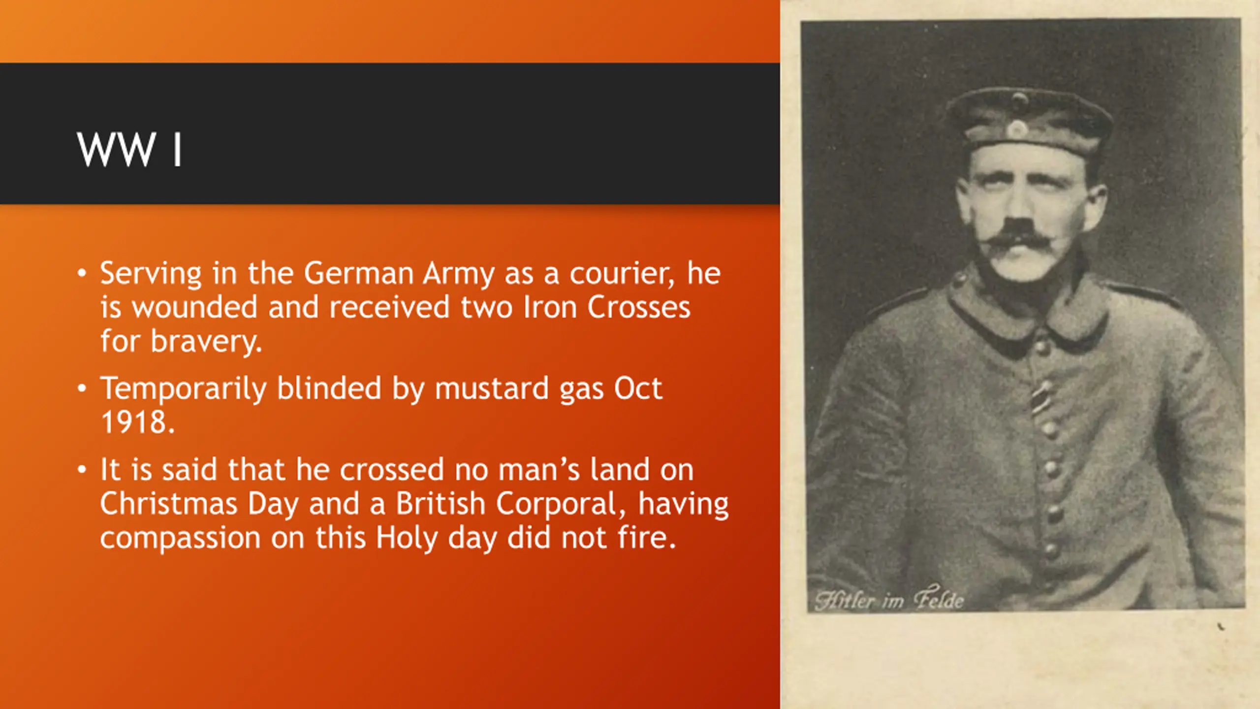 WW I Serving in the German Army as a courier, he is wounded and received two Iron Crosses for bravery. Temporarily blinded by mustard gas Oct 1918. It is said that he crossed no man s land on Christmas Day and a British Corporal, having compassion on this Holy day did not fire.