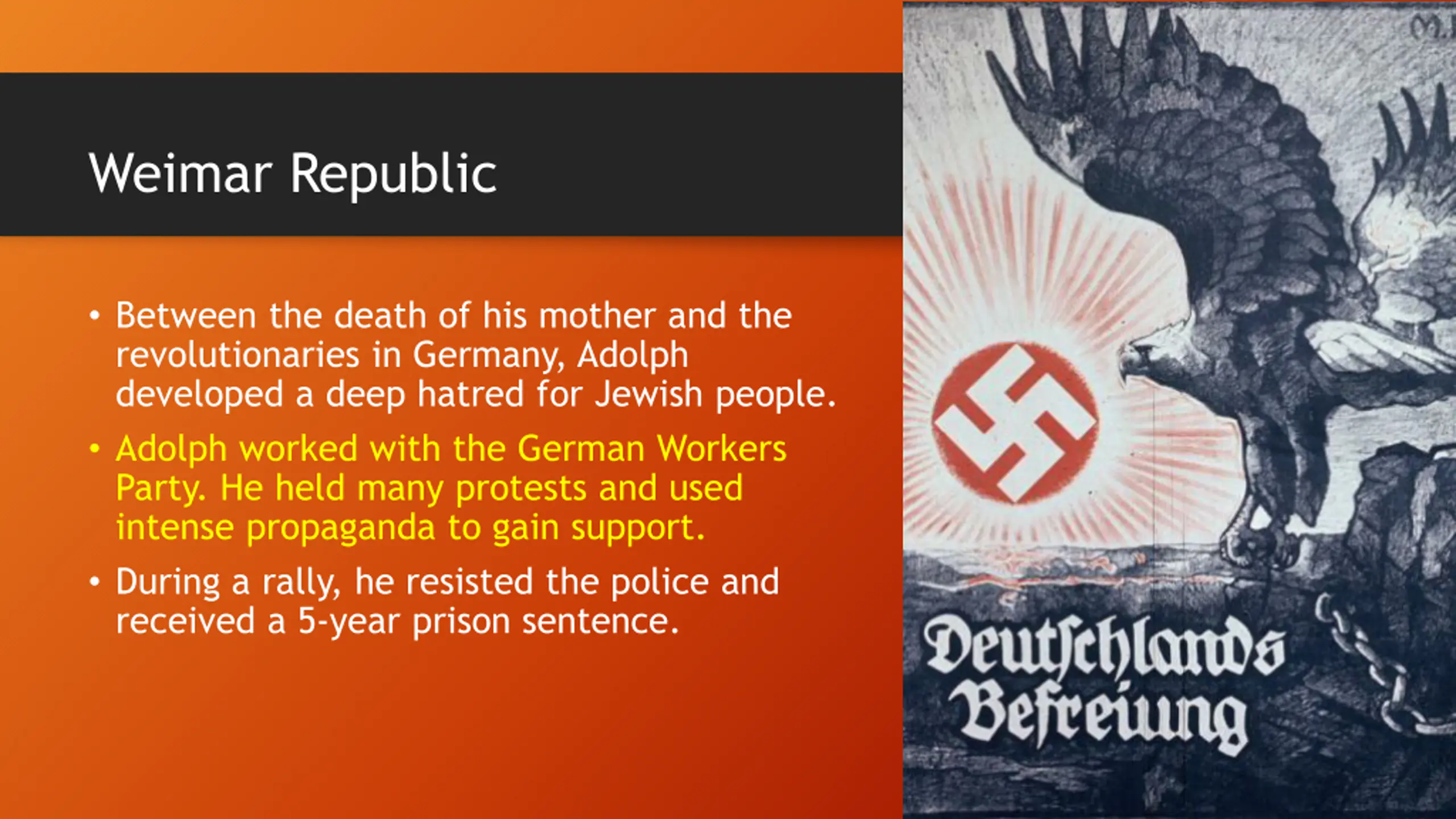 Weimar Republic Between the death of his mother and the revolutionaries in Germany, Adolph developed a deep hatred for Jewish people. Adolph worked with the German Workers Party. He held many protests and used intense propaganda to gain support. During a rally, he resisted the police and received a 5-year prison sentence.