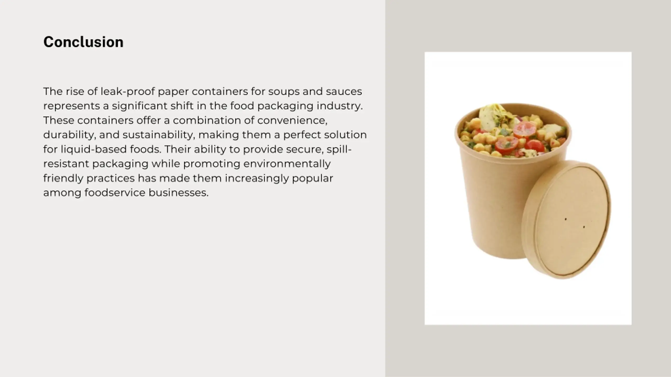 Conclusion The rise of leak-proof paper containers for soups and sauces represents a significant shift in the food packaging industry. These containers offer a combination of convenience, durability, and sustainability, making them a perfect solution for liquid-based foods. Their ability to provide secure, spill- resistant packaging while promoting environmentally friendly practices has made them increasingly popular among foodservice businesses.