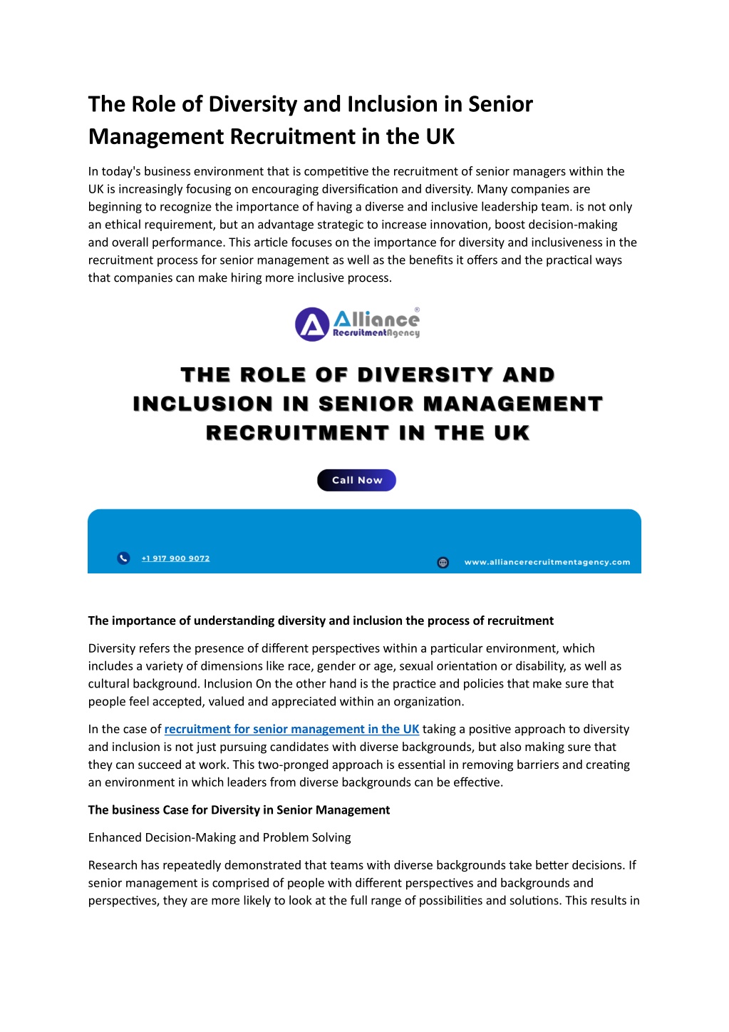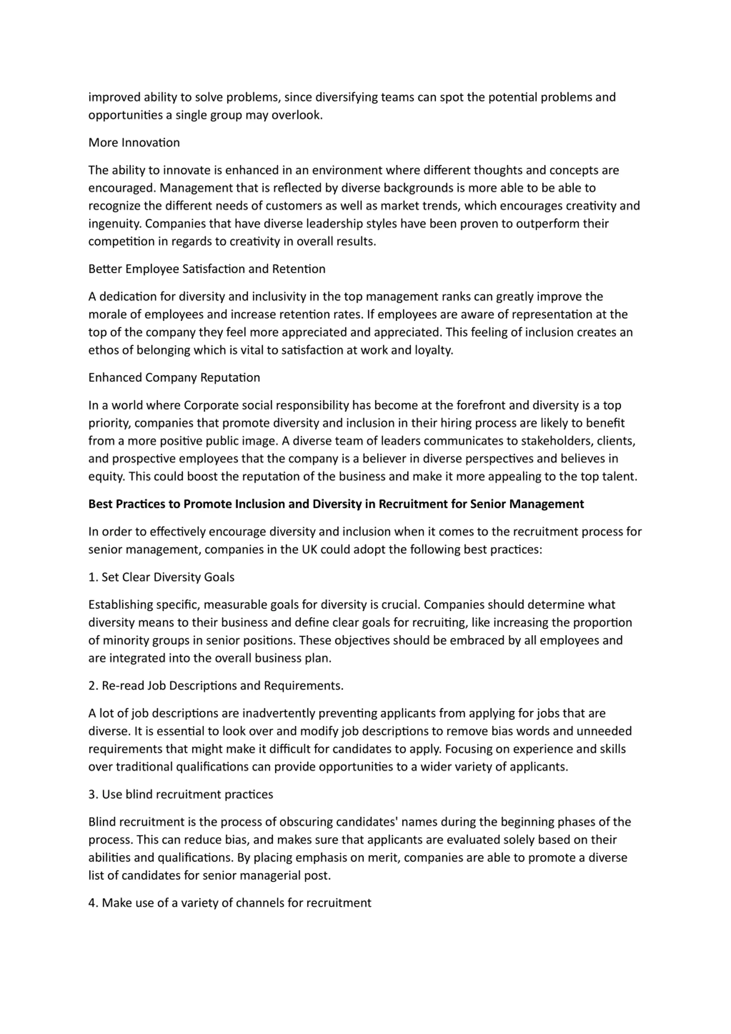 improved ability to solve problems, since diversifying teams can spot the potential problems and opportunities a single group may overlook. More Innovation The ability to innovate is enhanced in an environment where different thoughts and concepts are encouraged. Management that is reflected by diverse backgrounds is more able to be able to recognize the different needs of customers as well as market trends, which encourages creativity and ingenuity. Companies that have diverse leadership styles have been proven to outperform their competition in regards to creativity in overall results. Better Employee Satisfaction and Retention A dedication for diversity and inclusivity in the top management ranks can greatly improve the morale of employees and increase retention rates. If employees are aware of representation at the top of the company they feel more appreciated and appreciated. This feeling of inclusion creates an ethos of belonging which is vital to satisfaction at work and loyalty. Enhanced Company Reputation In a world where Corporate social responsibility has become at the forefront and diversity is a top priority, companies that promote diversity and inclusion in their hiring process are likely to benefit from a more positive public image. A diverse team of leaders communicates to stakeholders, clients, and prospective employees that the company is a believer in diverse perspectives and believes in equity. This could boost the reputation of the business and make it more appealing to the top talent. Best Practices to Promote Inclusion and Diversity in Recruitment for Senior Management In order to effectively encourage diversity and inclusion when it comes to the recruitment process for senior management, companies in the UK could adopt the following best practices: 1. Set Clear Diversity Goals Establishing specific, measurable goals for diversity is crucial. Companies should determine what diversity means to their business and define clear goals for recruiting, like increasing the proportion of minority groups in senior positions. These objectives should be embraced by all employees and are integrated into the overall business plan. 2. Re-read Job Descriptions and Requirements. A lot of job descriptions are inadvertently preventing applicants from applying for jobs that are diverse. It is essential to look over and modify job descriptions to remove bias words and unneeded requirements that might make it difficult for candidates to apply. Focusing on experience and skills over traditional qualifications can provide opportunities to a wider variety of applicants. 3. Use blind recruitment practices Blind recruitment is the process of obscuring candidates' names during the beginning phases of the process. This can reduce bias, and makes sure that applicants are evaluated solely based on their abilities and qualifications. By placing emphasis on merit, companies are able to promote a diverse list of candidates for senior managerial post. 4. Make use of a variety of channels for recruitment