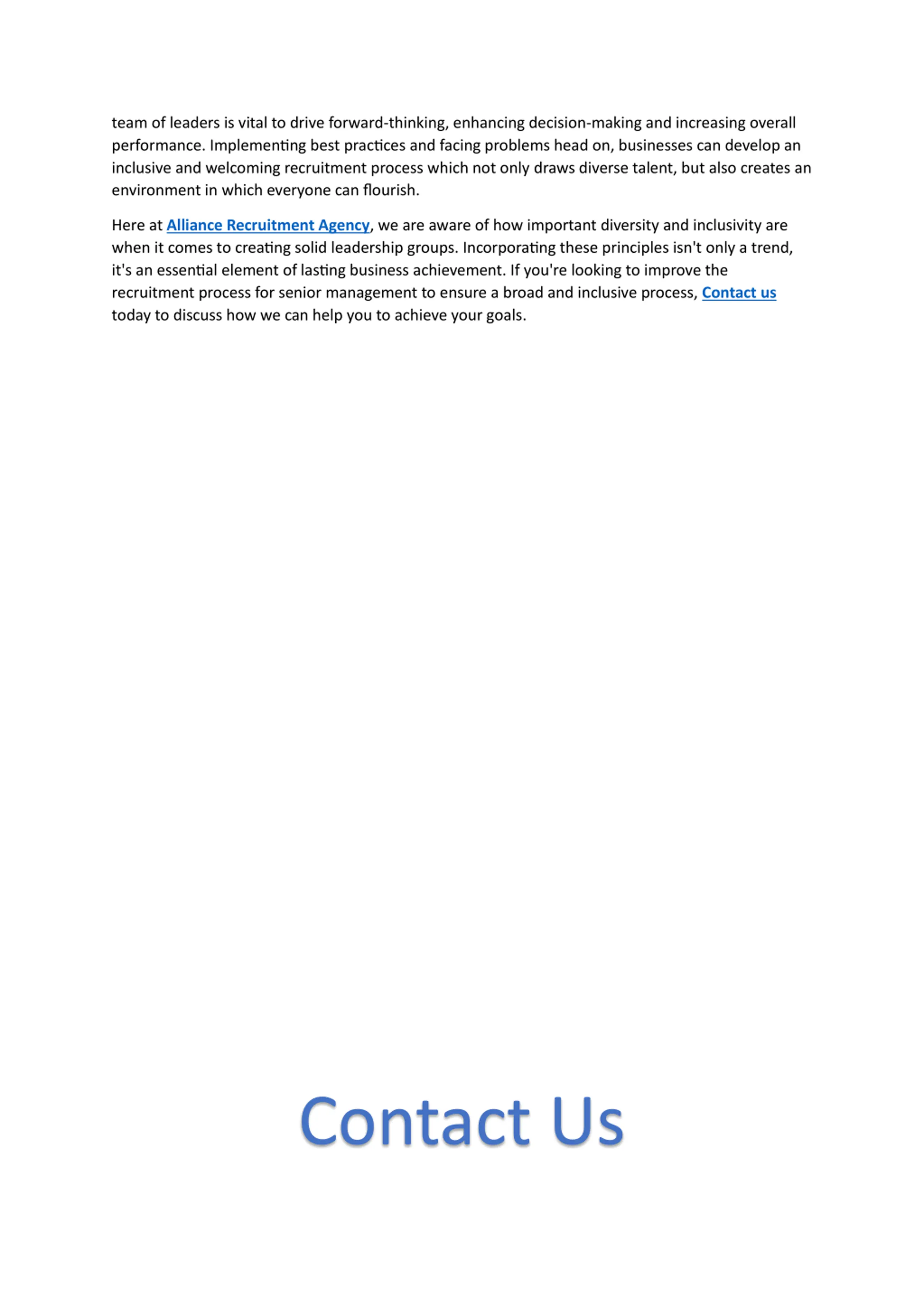 team of leaders is vital to drive forward-thinking, enhancing decision-making and increasing overall performance. Implementing best practices and facing problems head on, businesses can develop an inclusive and welcoming recruitment process which not only draws diverse talent, but also creates an environment in which everyone can flourish. Here at Alliance Recruitment Agency, we are aware of how important diversity and inclusivity are when it comes to creating solid leadership groups. Incorporating these principles isn't only a trend, it's an essential element of lasting business achievement. If you're looking to improve the recruitment process for senior management to ensure a broad and inclusive process, Contact us today to discuss how we can help you to achieve your goals. Contact Us
