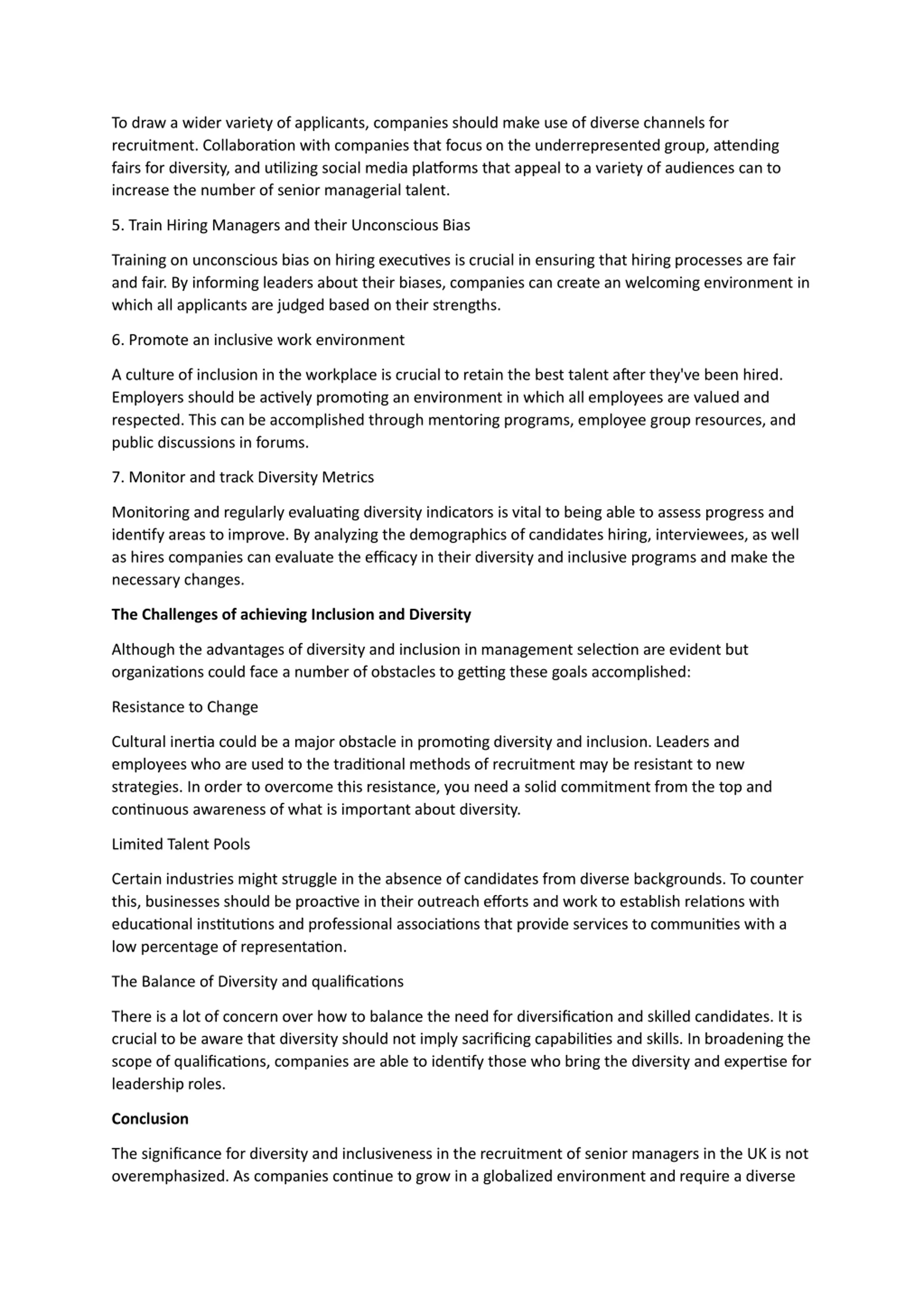 To draw a wider variety of applicants, companies should make use of diverse channels for recruitment. Collaboration with companies that focus on the underrepresented group, attending fairs for diversity, and utilizing social media platforms that appeal to a variety of audiences can to increase the number of senior managerial talent. 5. Train Hiring Managers and their Unconscious Bias Training on unconscious bias on hiring executives is crucial in ensuring that hiring processes are fair and fair. By informing leaders about their biases, companies can create an welcoming environment in which all applicants are judged based on their strengths. 6. Promote an inclusive work environment A culture of inclusion in the workplace is crucial to retain the best talent after they've been hired. Employers should be actively promoting an environment in which all employees are valued and respected. This can be accomplished through mentoring programs, employee group resources, and public discussions in forums. 7. Monitor and track Diversity Metrics Monitoring and regularly evaluating diversity indicators is vital to being able to assess progress and identify areas to improve. By analyzing the demographics of candidates hiring, interviewees, as well as hires companies can evaluate the efficacy in their diversity and inclusive programs and make the necessary changes. The Challenges of achieving Inclusion and Diversity Although the advantages of diversity and inclusion in management selection are evident but organizations could face a number of obstacles to getting these goals accomplished: Resistance to Change Cultural inertia could be a major obstacle in promoting diversity and inclusion. Leaders and employees who are used to the traditional methods of recruitment may be resistant to new strategies. In order to overcome this resistance, you need a solid commitment from the top and continuous awareness of what is important about diversity. Limited Talent Pools Certain industries might struggle in the absence of candidates from diverse backgrounds. To counter this, businesses should be proactive in their outreach efforts and work to establish relations with educational institutions and professional associations that provide services to communities with a low percentage of representation. The Balance of Diversity and qualifications There is a lot of concern over how to balance the need for diversification and skilled candidates. It is crucial to be aware that diversity should not imply sacrificing capabilities and skills. In broadening the scope of qualifications, companies are able to identify those who bring the diversity and expertise for leadership roles. Conclusion The significance for diversity and inclusiveness in the recruitment of senior managers in the UK is not overemphasized. As companies continue to grow in a globalized environment and require a diverse