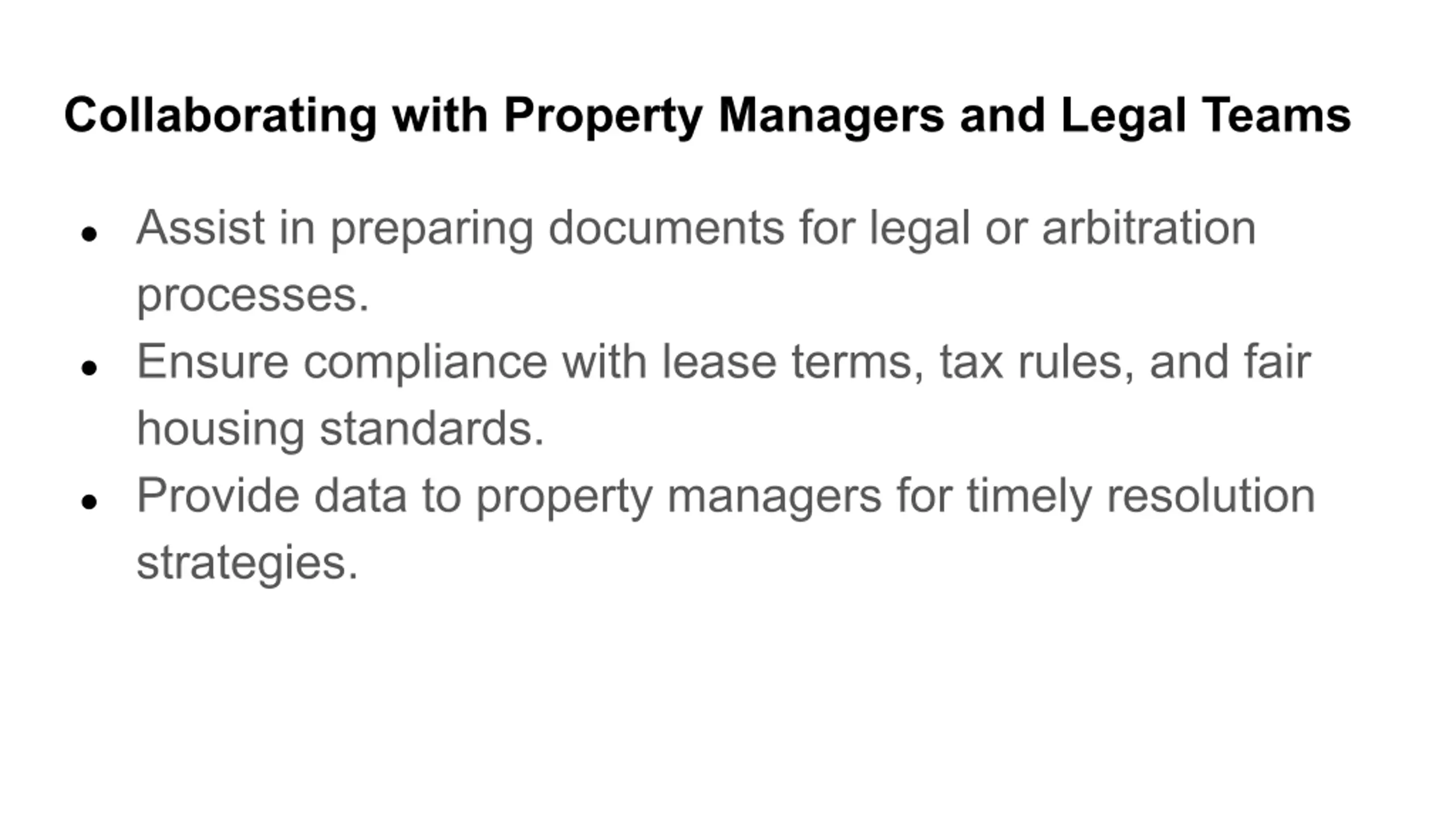 Collaborating with Property Managers and Legal Teams Assist in preparing documents for legal or arbitration processes. Ensure compliance with lease terms, tax rules, and fair housing standards. Provide data to property managers for timely resolution strategies.