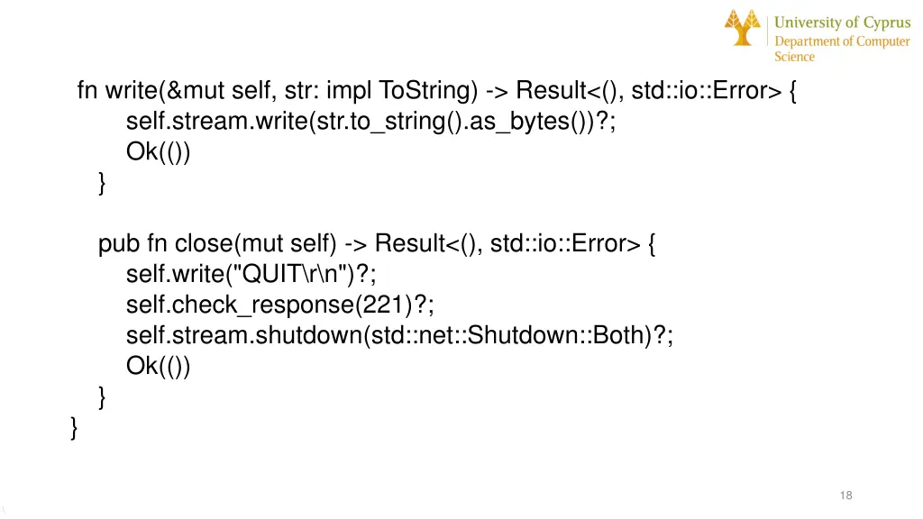 impl SMTPConnection { pub const SMTP_PORT: u16 = 25; pub fn new(server: String, username: String) -> Result<Self, std::io::Error> { let stream = TcpStream::connect((server, Self::SMTP_PORT))?; let reader = BufReader::new(stream.try_clone()?); let mut conn = SMTPConnection { stream, reader, username, response: String::new(), }; conn.check_response(220)?; conn.write(format!("HELO {}\r\n", conn.username))?; conn.check_response(250)?; Ok(conn) } 14