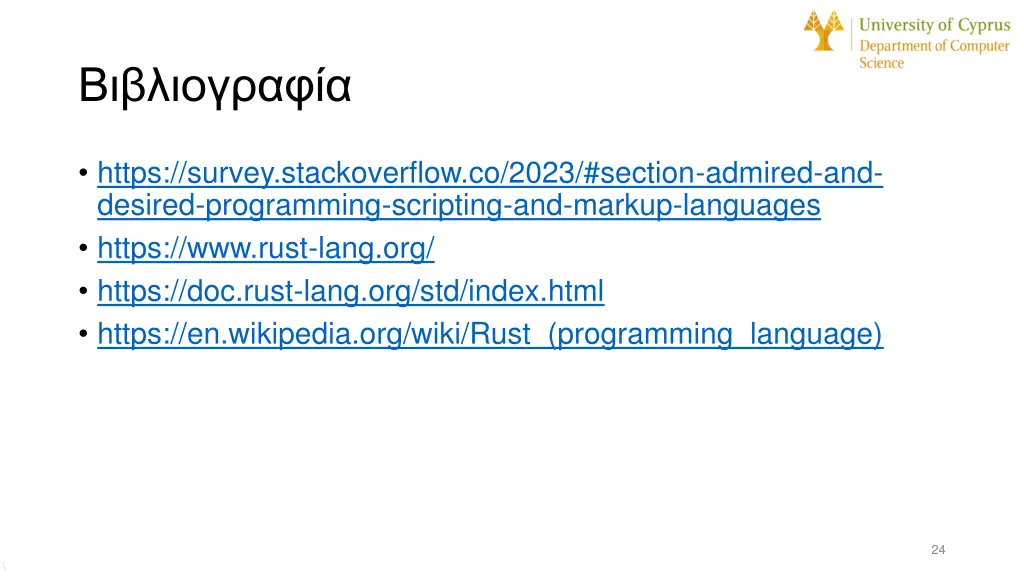 https://survey.stackoverflow.co/2023/#section-admired-and- desired-programming-scripting-and-markup-languages https://www.rust-lang.org/ https://doc.rust-lang.org/std/index.html https://en.wikipedia.org/wiki/Rust_(programming_language) 24